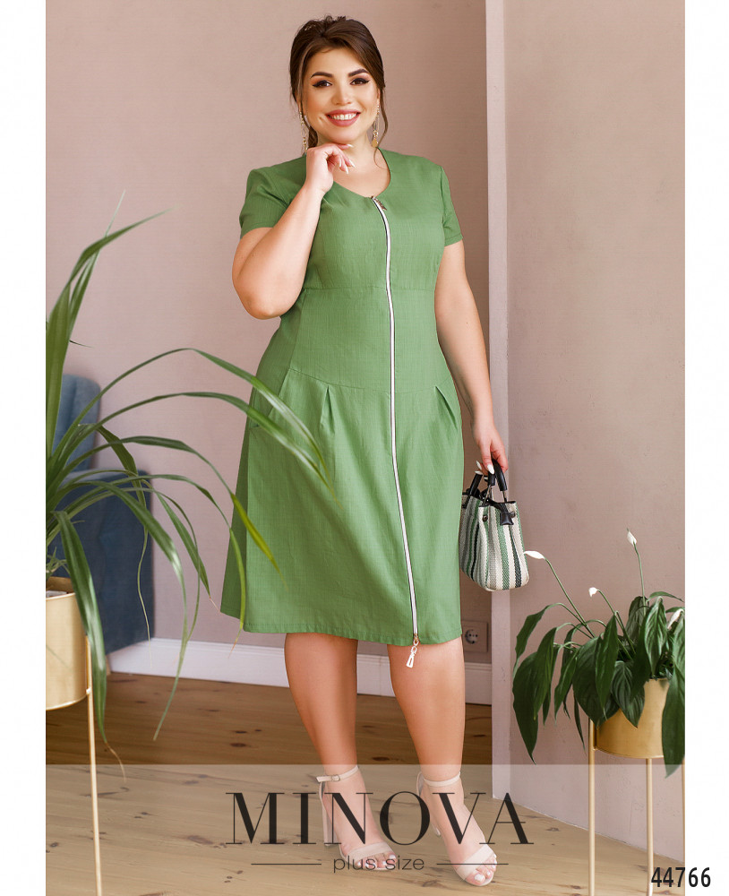 Нежное и минималистичное платье плюс сайз с полукруглым вырезом горловины, застёгивается на сквозную молнию спереди по центру. Рукава короткие, без манжет. На лифе полукруглые длинные вытачки, подол отрезной, на подоле сзади от талии - продольные вытачки, спереди ткань немного присобрана на поясе по бокам. Есть карманы.