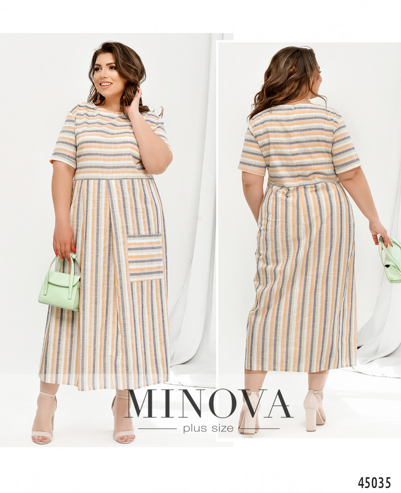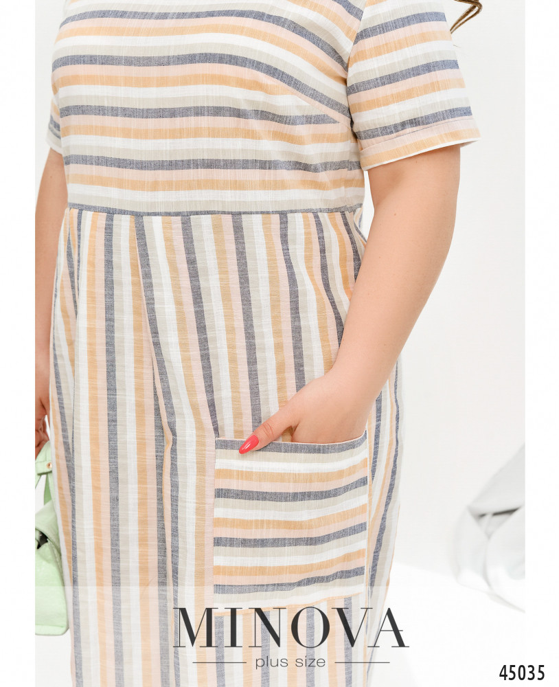Яркое и стильное платье батал в полоску. На бедре - накладной карман, рукава короткие, с небольшими подворотами. Застёжка - вшитая по спинке потайная молния. Подол отрезной. На груди вытачки. Ткань подола на талии слегка присобрана плиссированными оборками. Вырез горловины полукруглый.