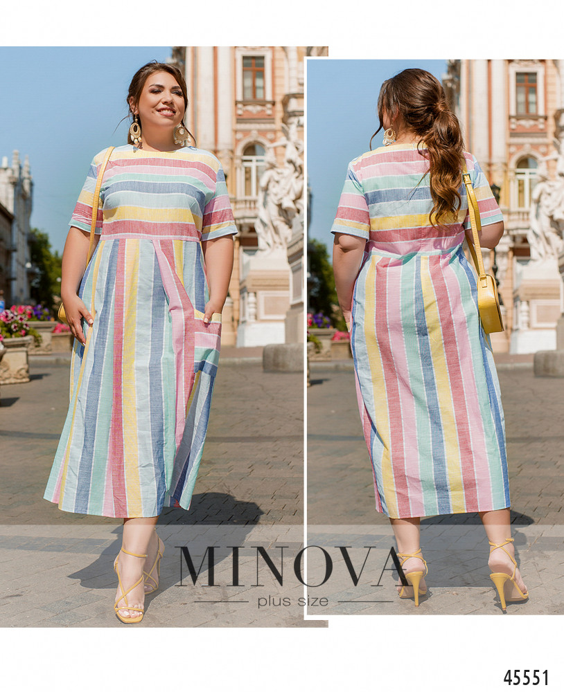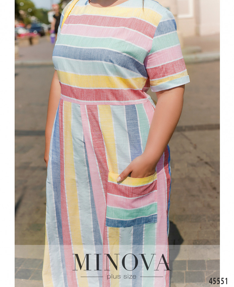 Яркое и стильное платье батал в полоску. На бедре - накладной карман, рукава короткие, с небольшими подворотами. Застёжка - вшитая по спинке потайная молния. Подол отрезной. На груди вытачки. Ткань подола на талии слегка присобрана плиссированными оборками. Вырез горловины полукруглый. Пояс НЕ входит в комплект.