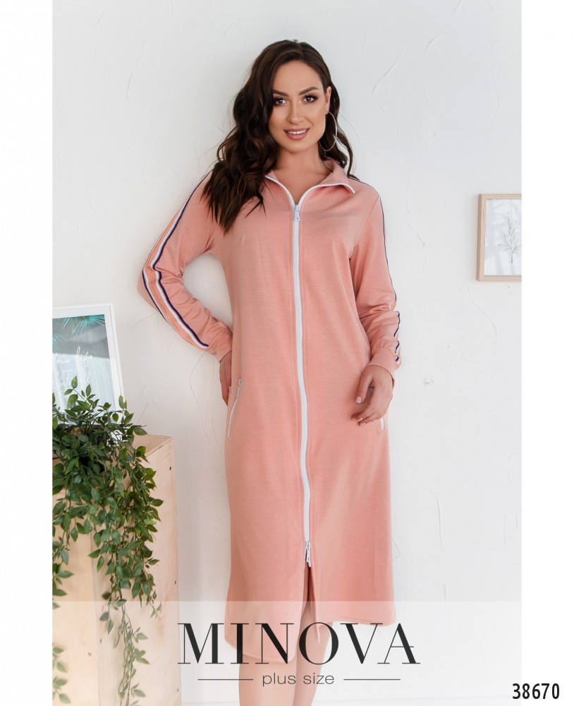 Стильное платье батал на каждый день в спортивном стиле. Застёгивается на молнию по центру, по бокам – врезные карманы под молнией. Рукава с мягкими небольшими манжетами. Воротник невысокий. На рукавах – контрастные ленты.
