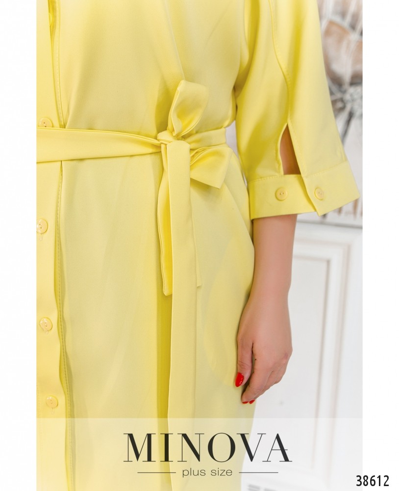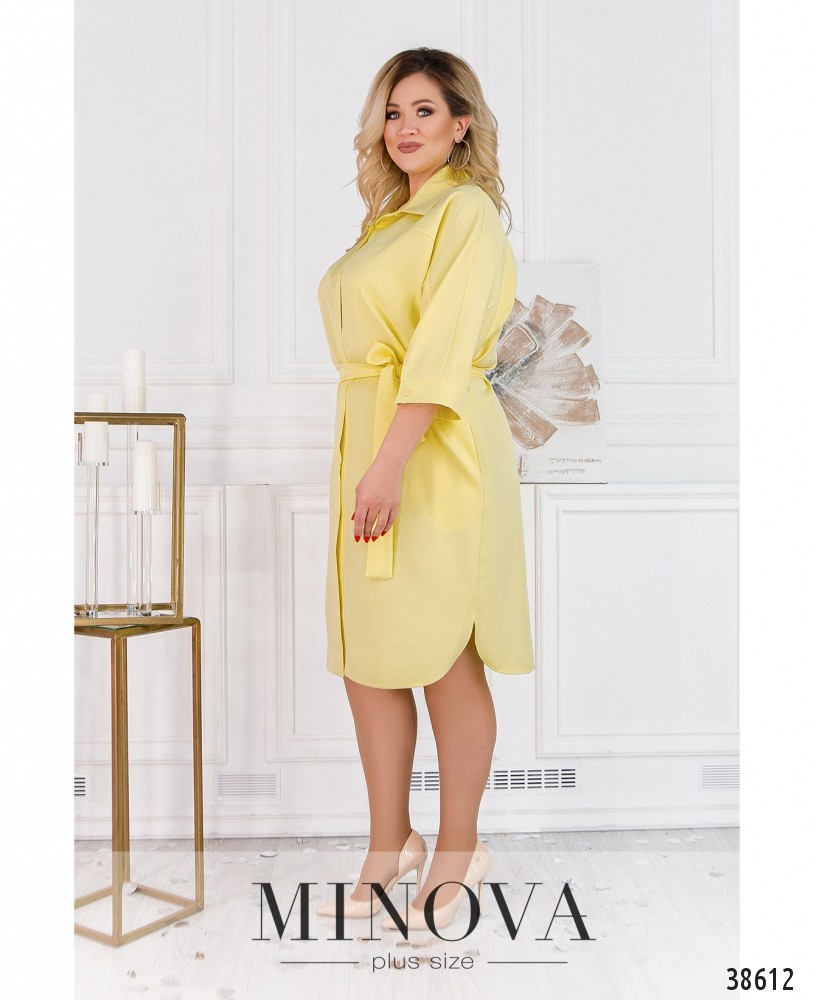 Милое однотонное, но яркое платье батал с поясом. Воротничок отложной, карманов нет, застёжка - ряд пуговиц спереди на планке. Рукава с небольшими манжетами, на манжетах - по одной пуговице. По бокам подола - небольшие разрезы.