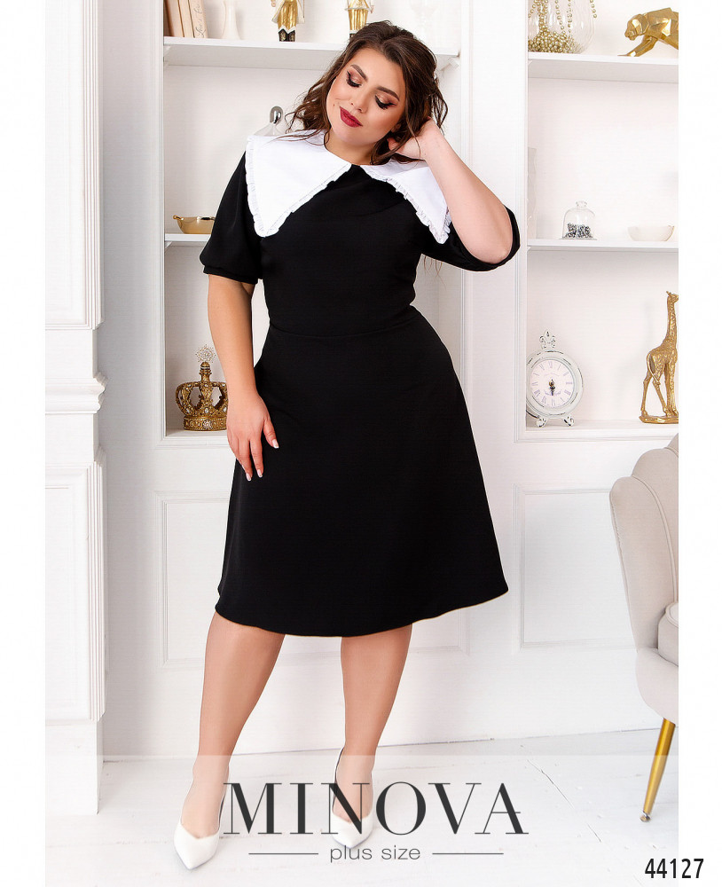 Стильное платье батал с ярким крупным отложным воротничком с оборками. На спине на талии вытачки. Рукава-фонарики с небольшими манжетами без пуговиц. Подол отрезной. Карманов нет. Застёжка - молния, вшитая по спинке.