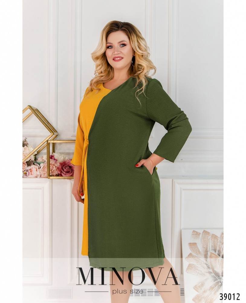 Необычное асимметричное платье батал со вшитым с правой стороны в талию шнурком. Рукава без манжет, по бокам - врезные карманы. Подол асимметричный, по правой стороне чуть короче. Без застёжек.
