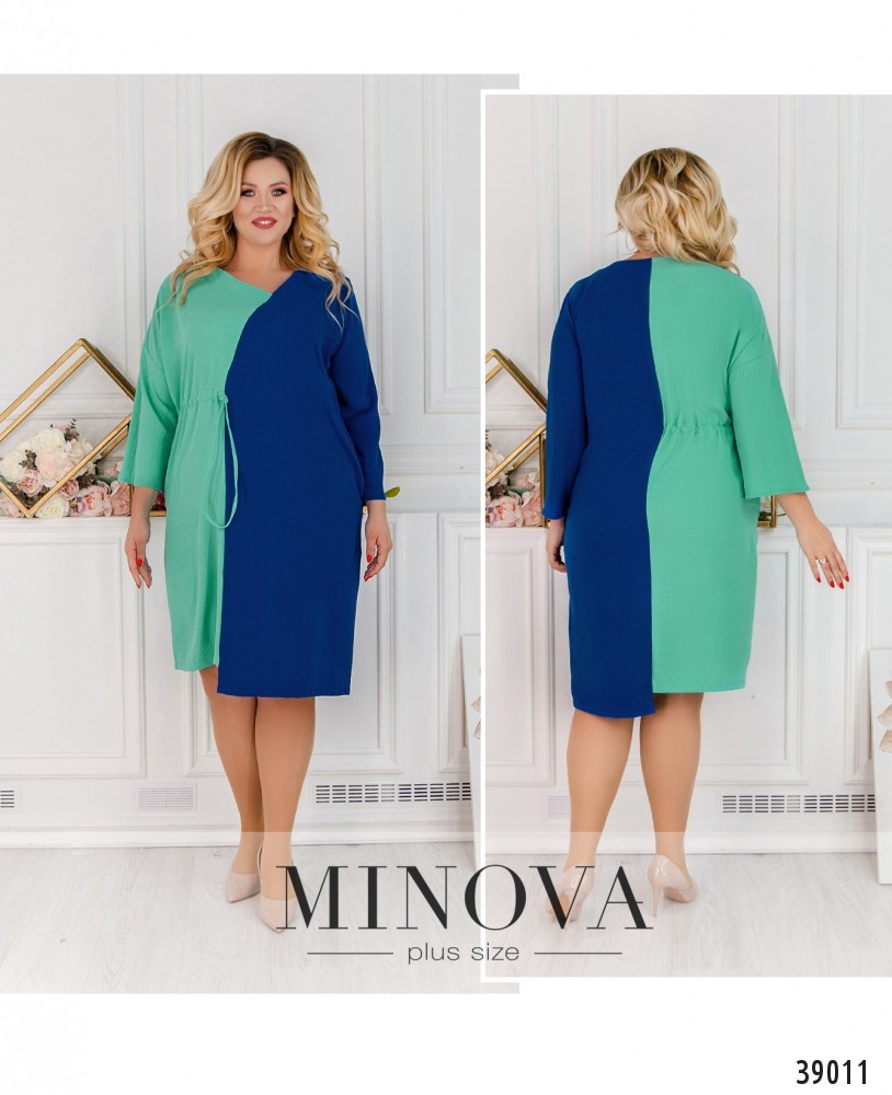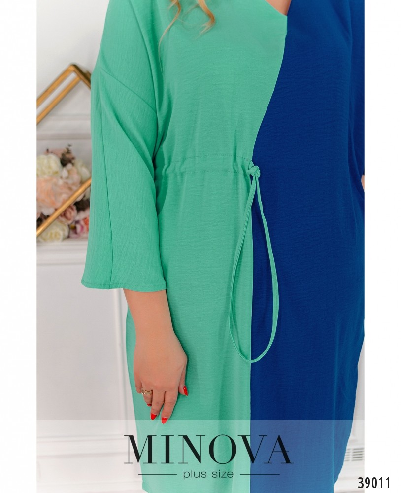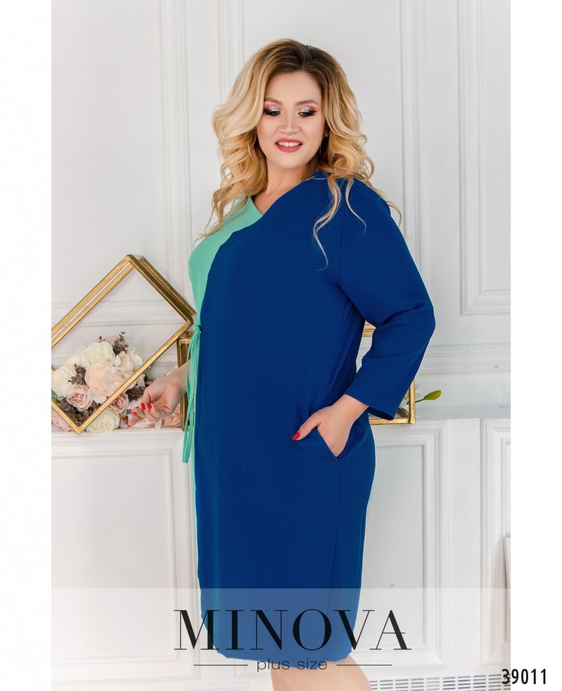 Необычное асимметричное платье батал со вшитым с правой стороны в талию шнурком. Рукава без манжет, по бокам - врезные карманы. Подол асимметричный, по правой стороне чуть короче. Без застёжек.