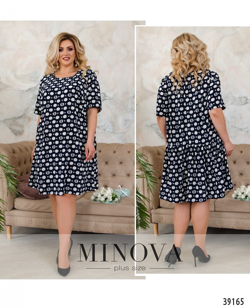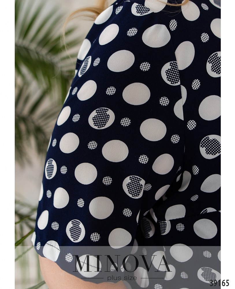 Платье батал в крупный горох, без застёжек и карманов, со свободными рукавами и полукруглым вырезом горловины. Передняя часть ровная, спинка - с крупными оборками на подоле.
