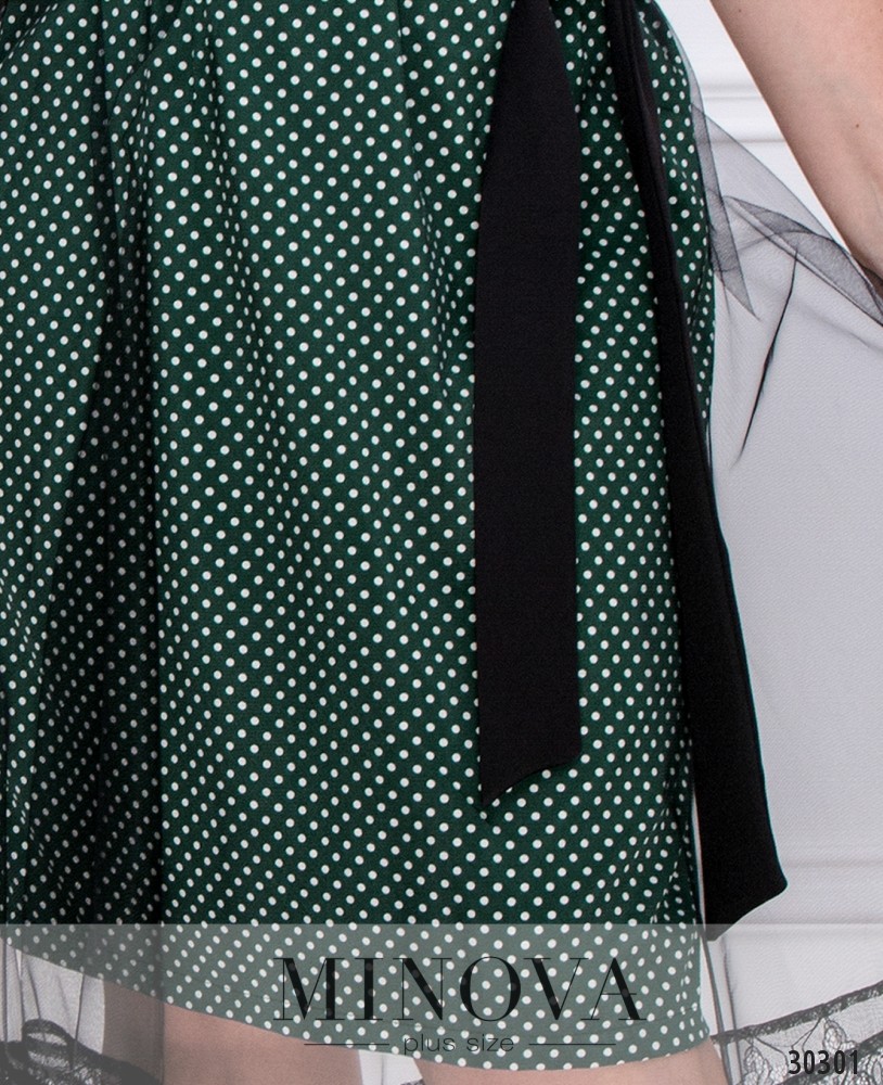Платье в горошек со съемной фатиновой юбкой. Платье с короткими рукавами. Украшенными деликатным кружевом. Лаконичная модель украшена юбкой из сетки с кружевным подолом. Юбка надевается сверху на платье и застегивается на пуговицу. Талия дополнена широким мягким поясом. На спине платье застегивается на скрытую молнию.