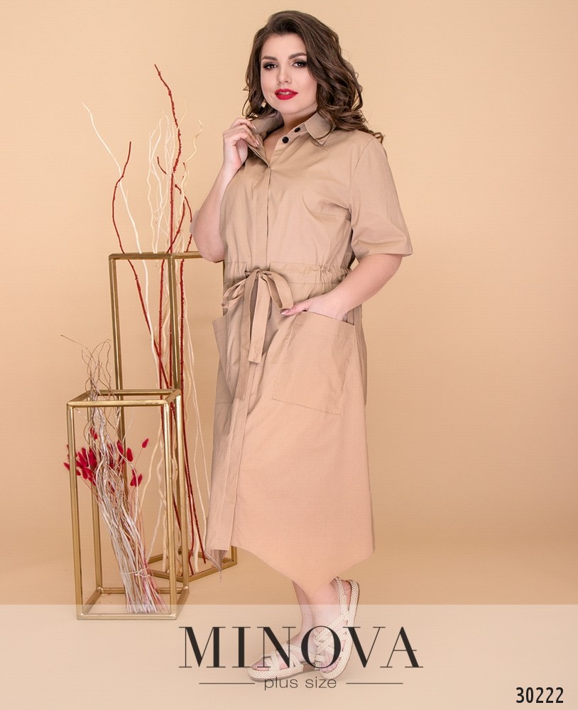 Платье-рубашка в стиле «сафари» с асимметричным подолом. Платье полностью застегивается на пуговицы на лицевой стороне. Талия регулируется вшитым поясом-кулиской и завязывается на лицевой стороне. Подол дополнен накладными карманами.