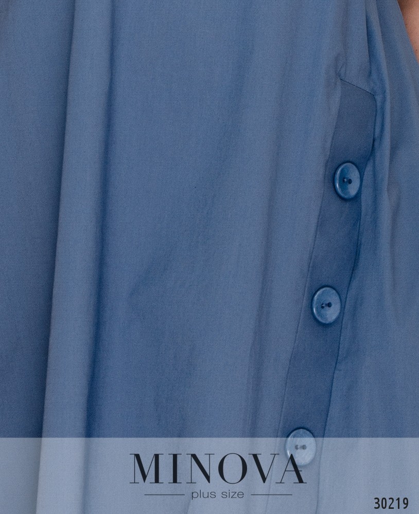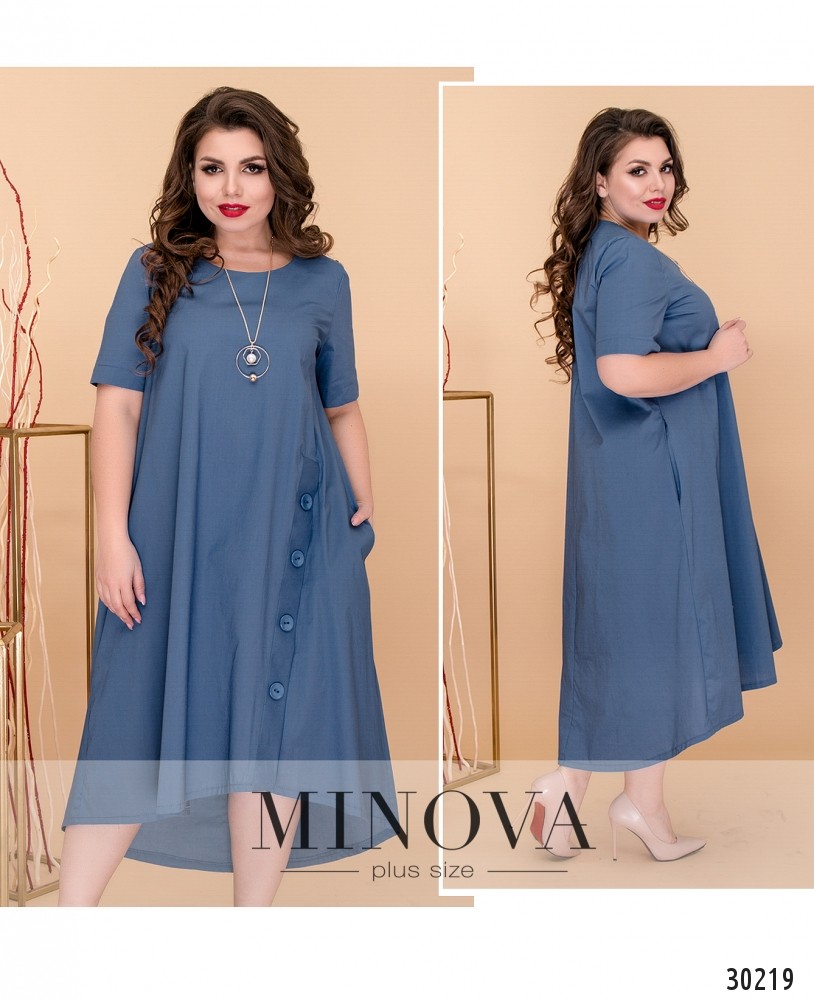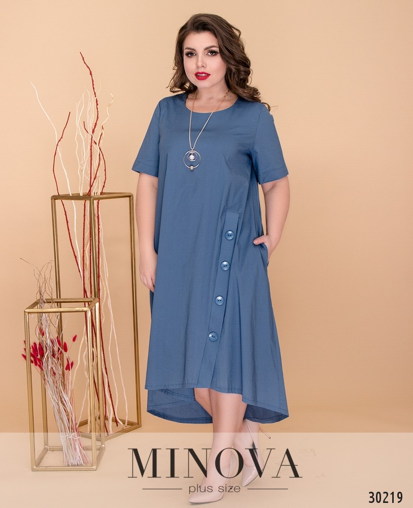 Свободное платье с неровным подолом. Платье с короткими рукавами от груди свободно ниспадает. Объемный подол украшен декоративными пуговицами на лицевой стороне.