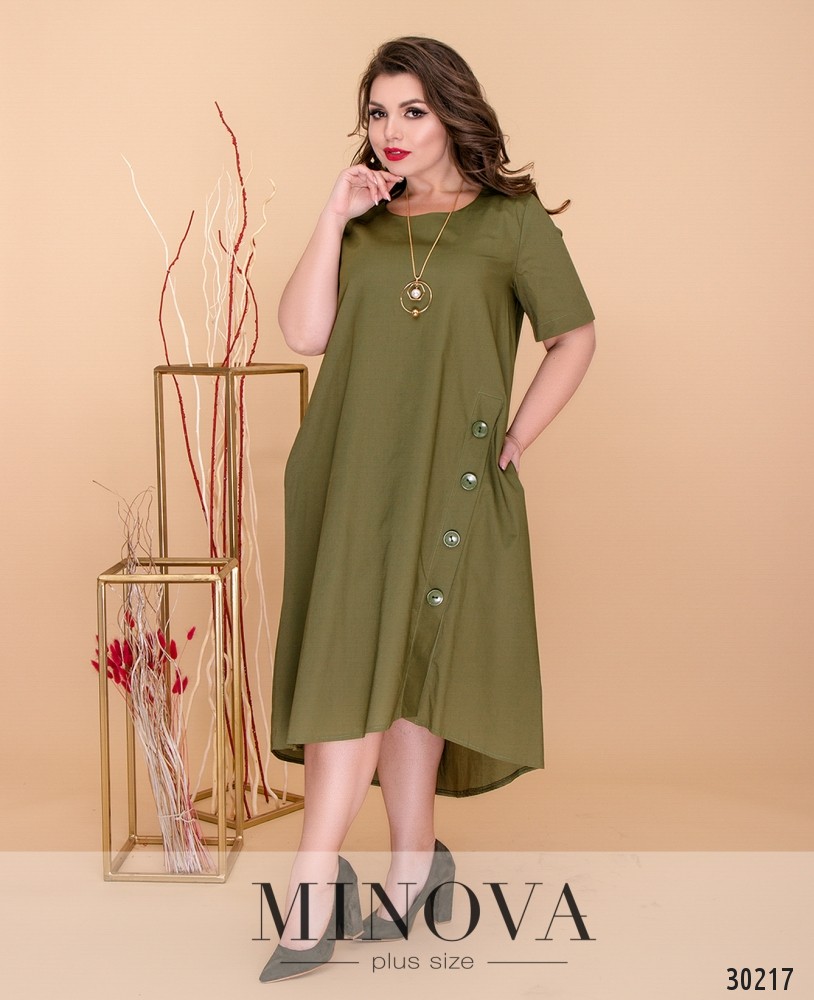 Свободное платье с неровным подолом. Платье с короткими рукавами от груди свободно ниспадает. Объемный подол украшен декоративными пуговицами на лицевой стороне.