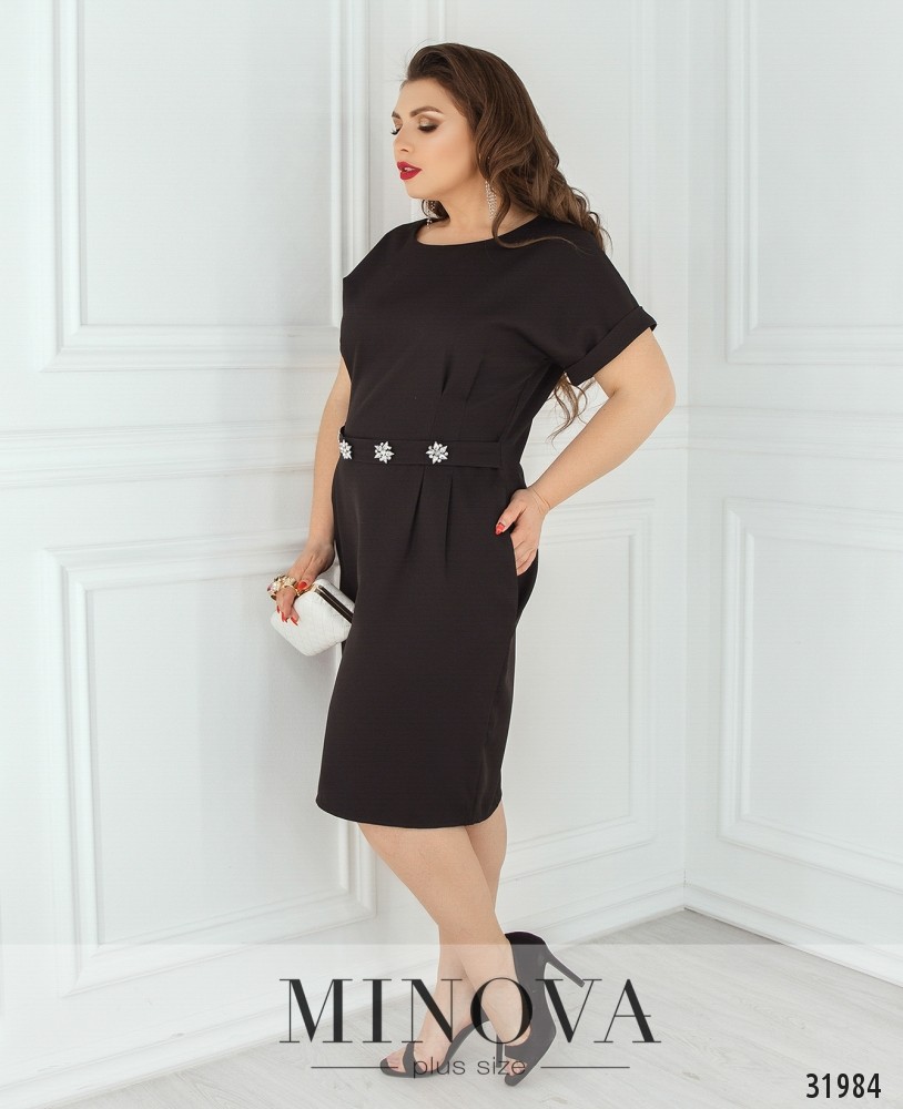 Платье по фигуре с акцентом на талии. Платье с короткими рукавами, собранными во внешние манжеты. От линии пояса подол оформлен защипами и дополнен карманами. Талия подчеркнута поясом-вставкой с блестящими брошами. Спинка выполнена со вшитой молнией.