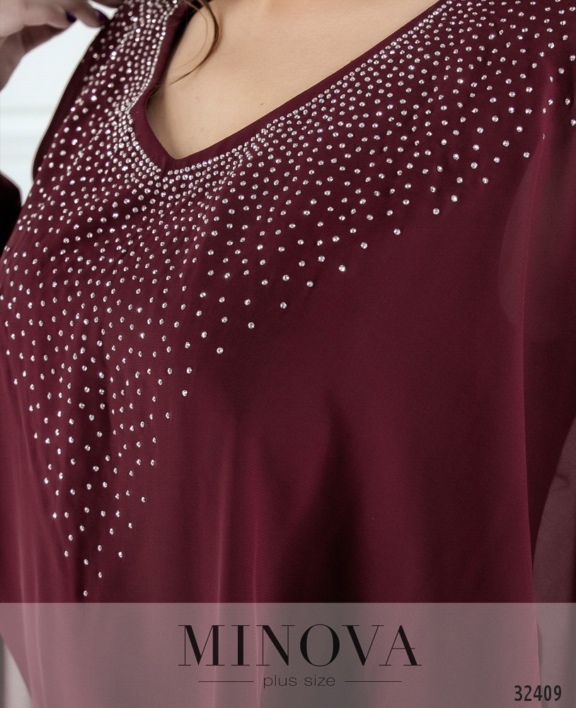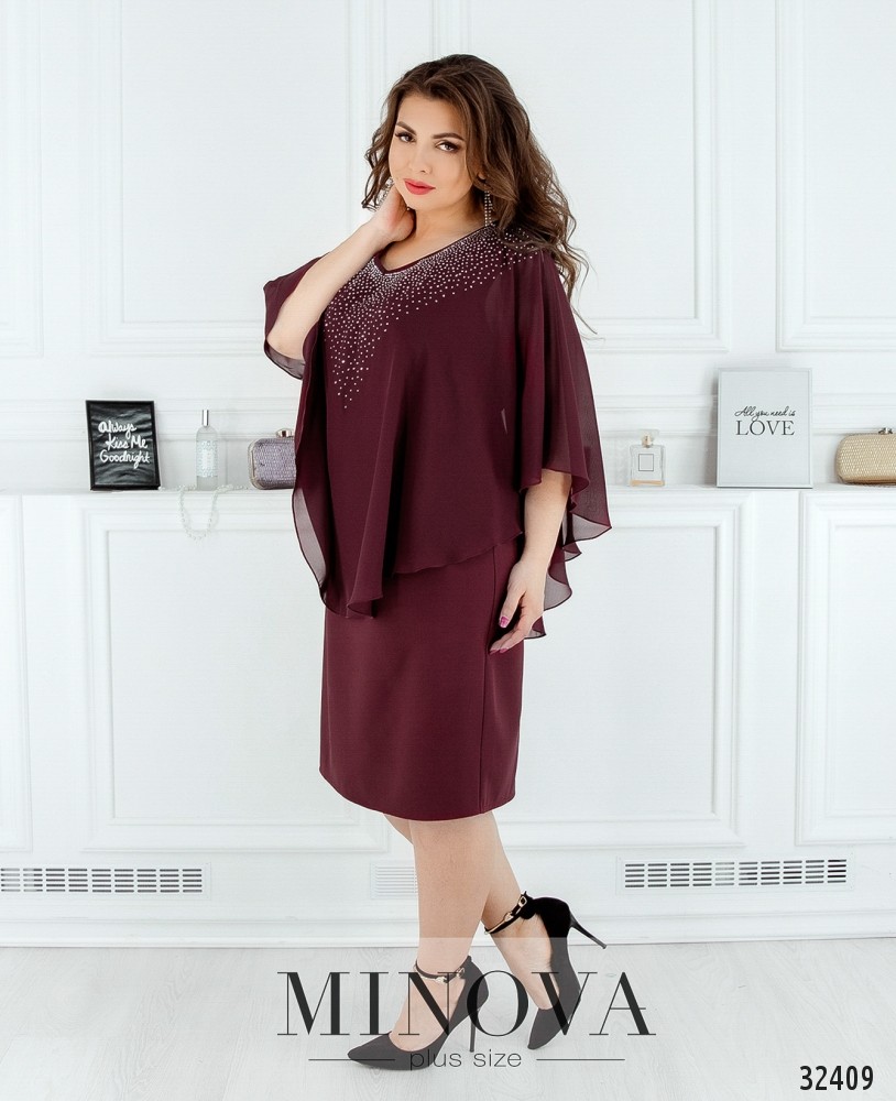 Платье батал от Minova с пришитой пелеринкой, украшенной стразами, выглядит как блуза с юбкой-карандашом. Свободное, приятное к телу, оно великолепно будет смотреться на девушке, у которой плечи уже, чем бёдра (типа «груша») – аакцент будет на верхней части. Сзади – небольшой вырез по спине, застёгивается на пуговку. Платье большого размера представлено в каталоге Minova в четырёх цветах, практически на все случаи жизни: строгое чёрное, романтическое кремовое, страстное бордо или нежное голубое. Рукава-крылышки не прилегают плотно к телу и придают образу воздушности.