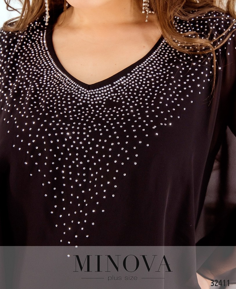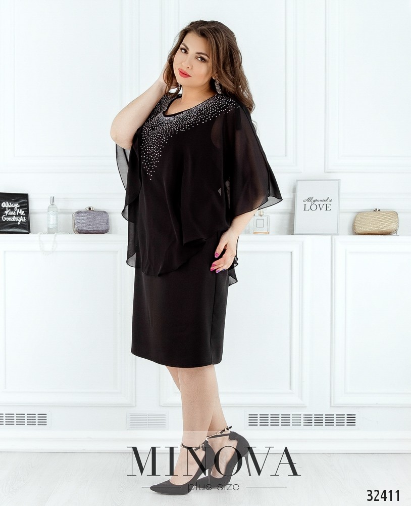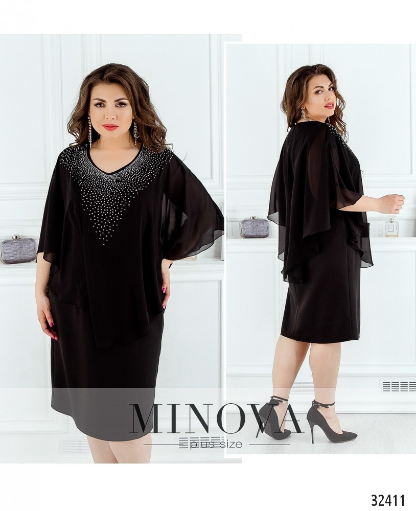 Платье батал от Minova с пришитой пелеринкой, украшенной стразами, выглядит как блуза с юбкой-карандашом. Свободное, приятное к телу, оно великолепно будет смотреться на девушке, у которой плечи уже, чем бёдра (типа «груша») – аакцент будет на верхней части. Сзади – небольшой вырез по спине, застёгивается на пуговку. Платье большого размера представлено в каталоге Minova в четырёх цветах, практически на все случаи жизни: строгое чёрное, романтическое кремовое, страстное бордо или нежное голубое. Рукава-крылышки не прилегают плотно к телу и придают образу воздушности.