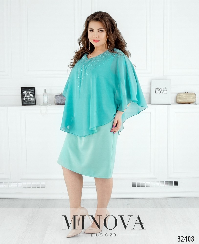 Платье батал от Minova с пришитой пелеринкой, украшенной стразами, выглядит как блуза с юбкой-карандашом. Свободное, приятное к телу, оно великолепно будет смотреться на девушке, у которой плечи уже, чем бёдра (типа «груша») – аакцент будет на верхней части. Сзади – небольшой вырез по спине, застёгивается на пуговку. Платье большого размера представлено в каталоге Minova в четырёх цветах, практически на все случаи жизни: строгое чёрное, романтическое кремовое, страстное бордо или нежное голубое. Рукава-крылышки не прилегают плотно к телу и придают образу воздушности.