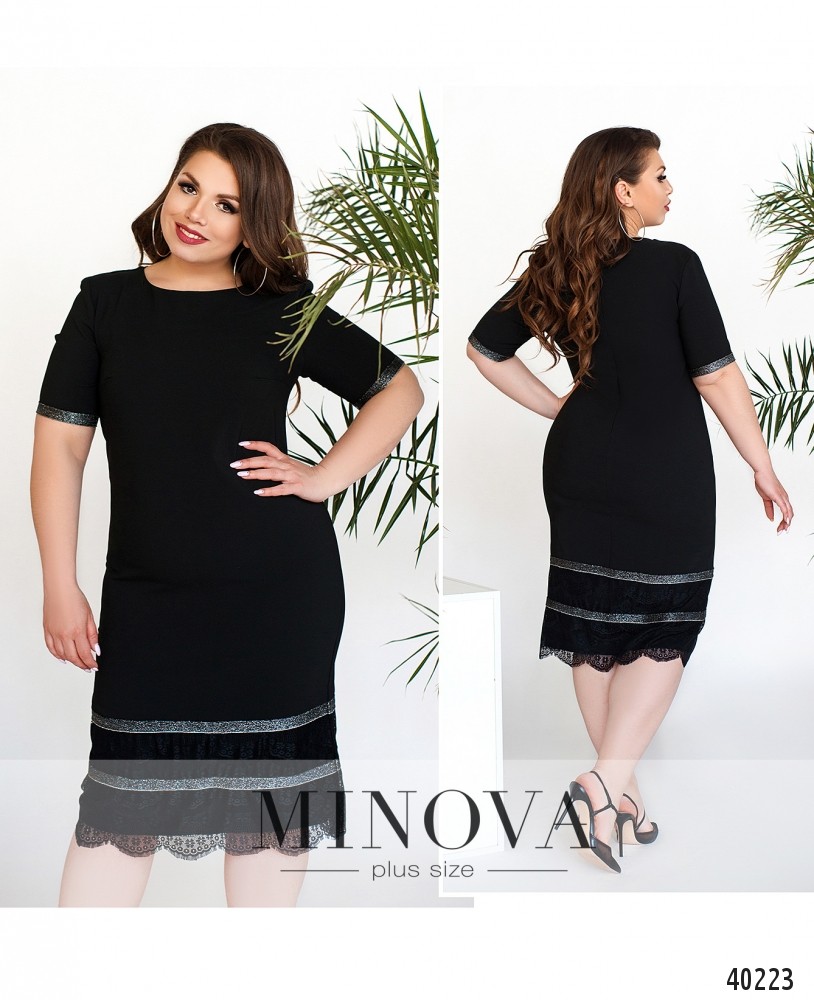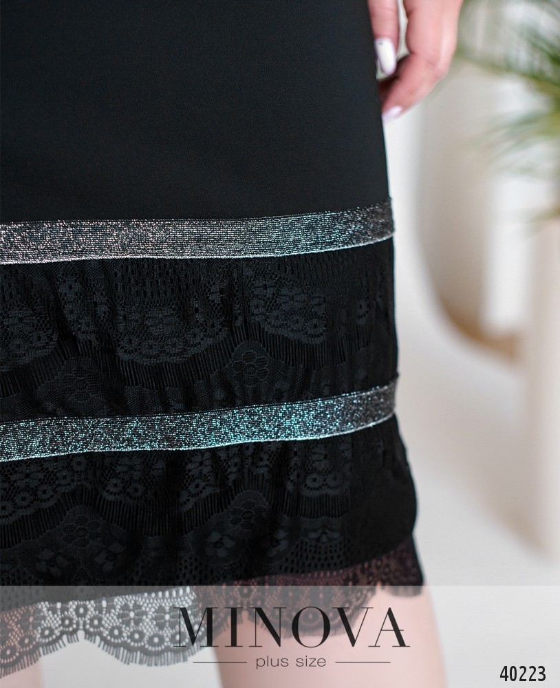 Женственное платье плюс сайз, украшенное блестящими лентами на подоле и рукавах, к подолу подшито тонкое кружево. Вырез горловины полукруглый, неглубокий. На груди - вытачки. Застёгивается на вшитую по спинке молнию. Карманов нет.