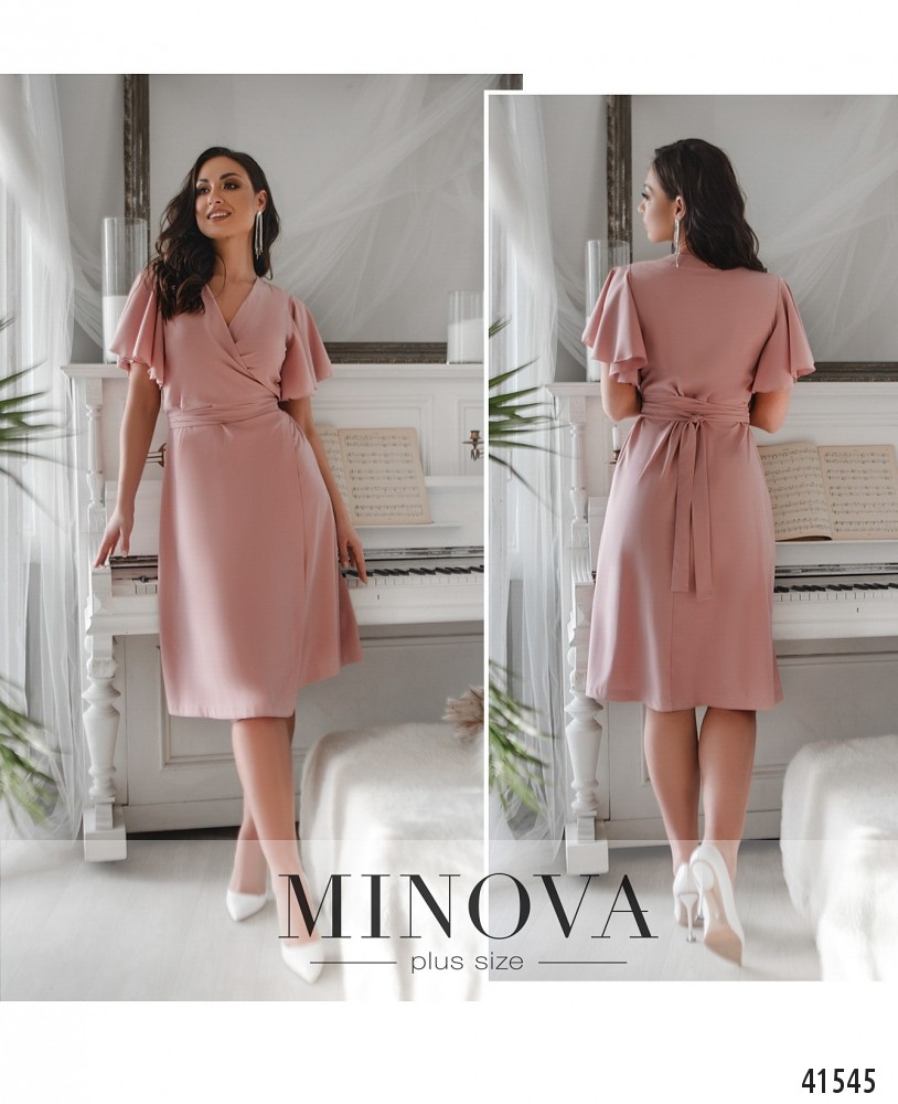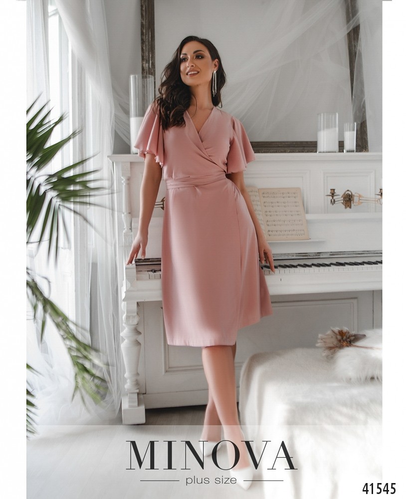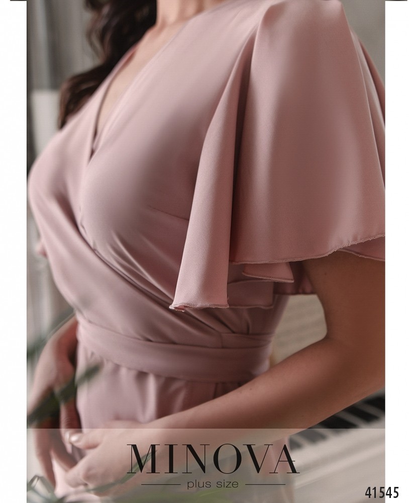 Романтичное платье батал без декора, с рукавами-крылышками. Завязывается на запАх, поясок продевается в прорезь сбоку на талии. Карманов и застёжек нет, подкладки нет. На груди вытачки.