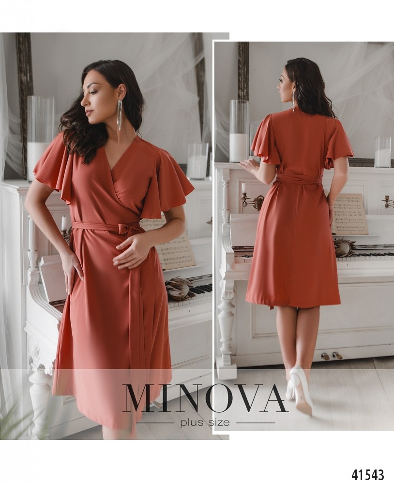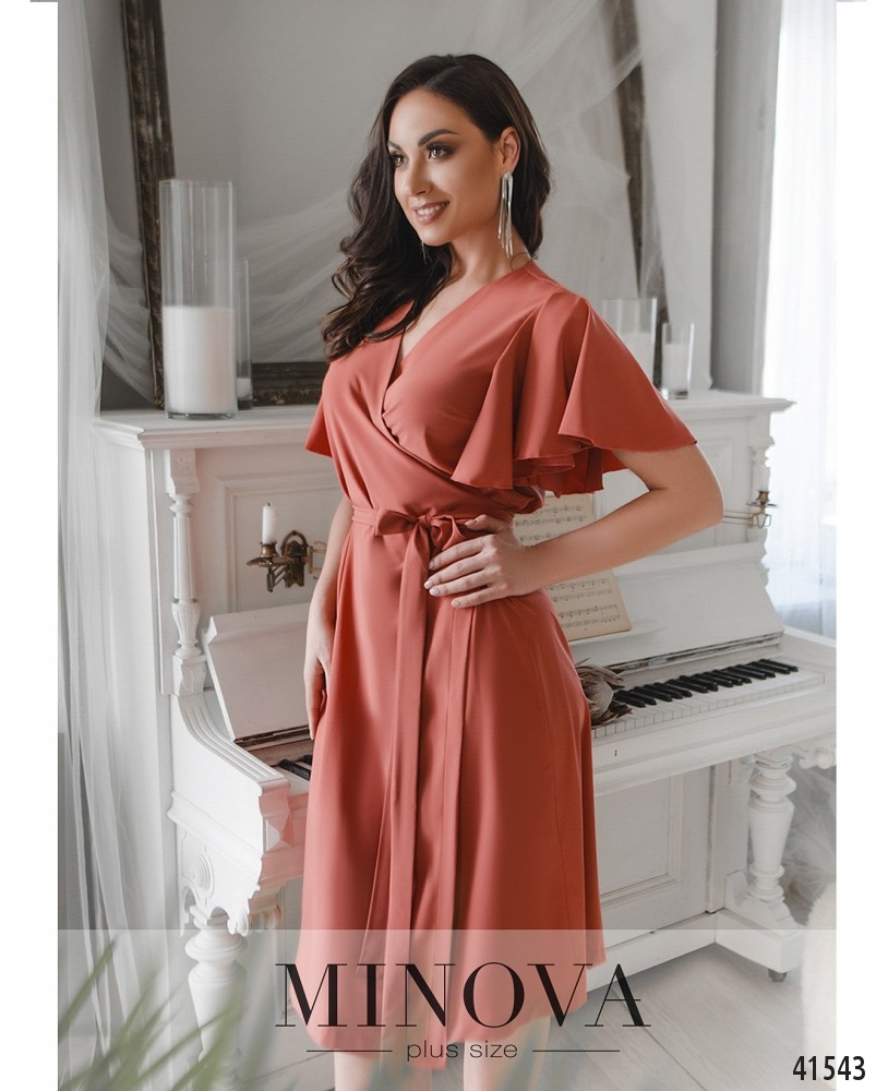 Романтичное платье батал без декора, с рукавами-крылышками. Завязывается на запАх, поясок продевается в прорезь сбоку на талии. Карманов и застёжек нет, подкладки нет. На груди вытачки.