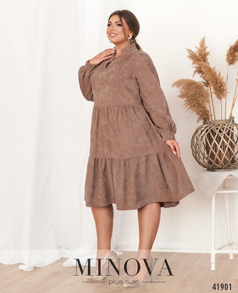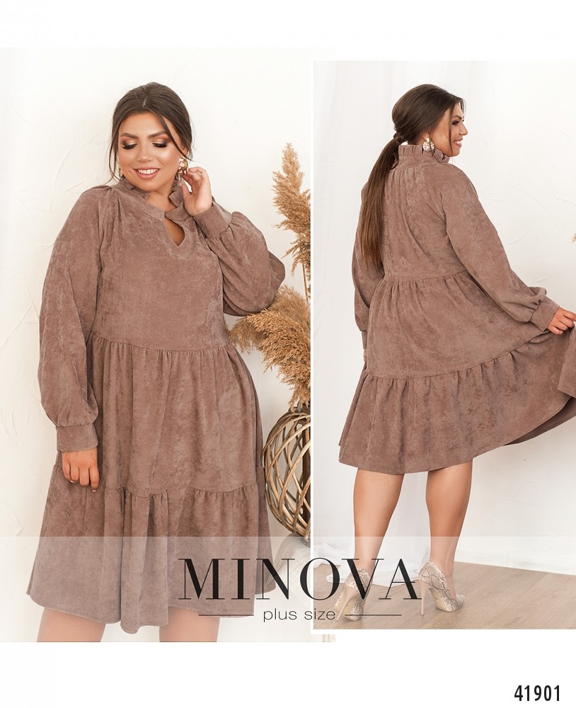 Мягкое платье батал А-силуэта без застёжек и карманов, воротник-стоечка с твёрдыми оборками. Рукава с мягкими манжетами. Подол подшит к верху и состоит из двух рядов оборок.