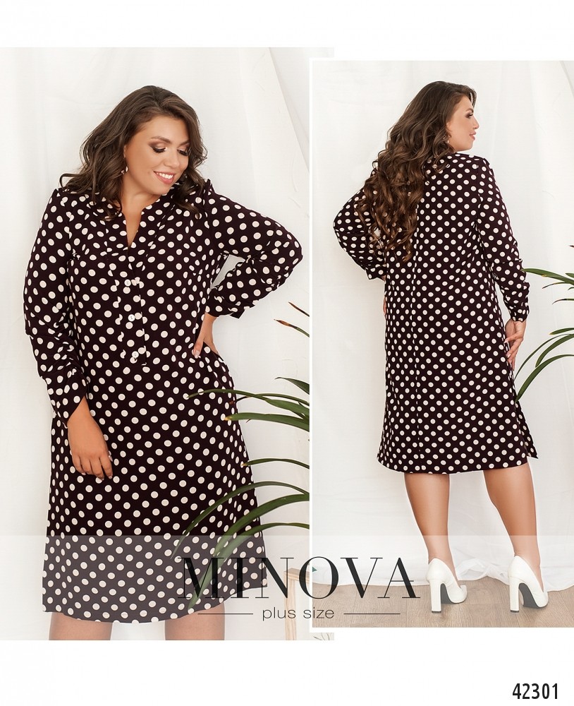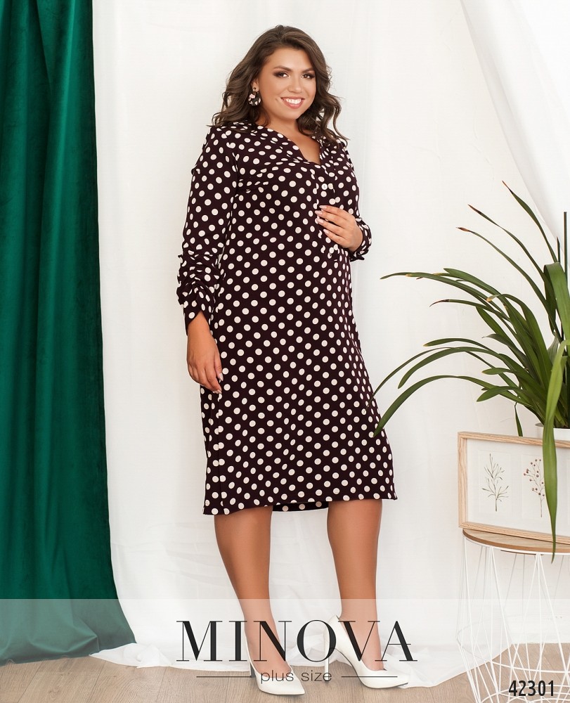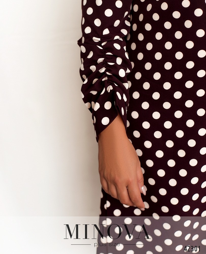 Нарядное платье батал в горошек, рукава с присобранной тканью на месте манжет, на груди вытачки. По бокам подола - разрезы. Застёгивается на три пуговицы. Карманов нет.