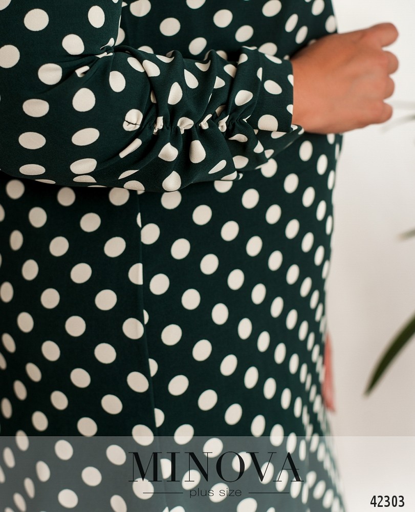 Нарядное платье батал в горошек, рукава с присобранной тканью на месте манжет, на груди вытачки. По бокам подола - разрезы. Застёгивается на три пуговицы. Карманов нет.