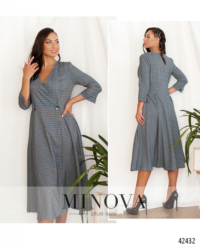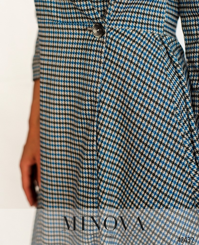 Клетчатое платье батал в стиле двубортного пальто, застёгивается на две пуговицы на запАх. Карманов нет, подкладки тоже нет. Рукава с небольшими манжетами, на манжетах по одной пуговице.