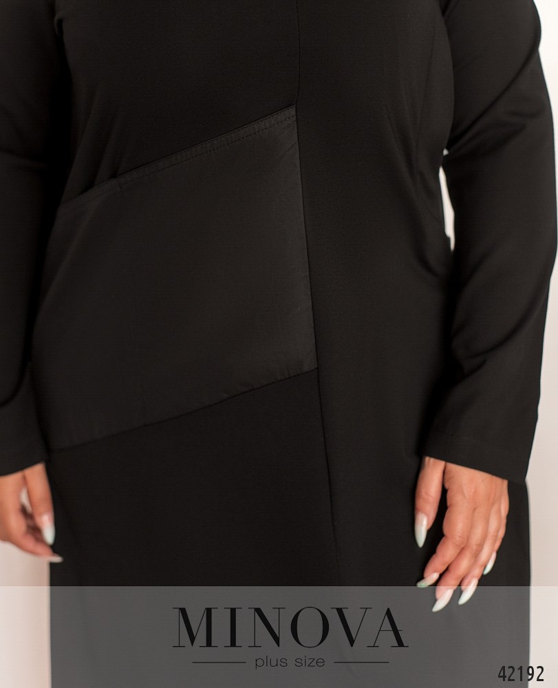 Элегантное платье батал без застёжек, справа - аппликации из другой ткани, выполняющие роль кармана. Рукава без манжет, вырез горловины полукруглый. Справа на боку ткань присобрана.