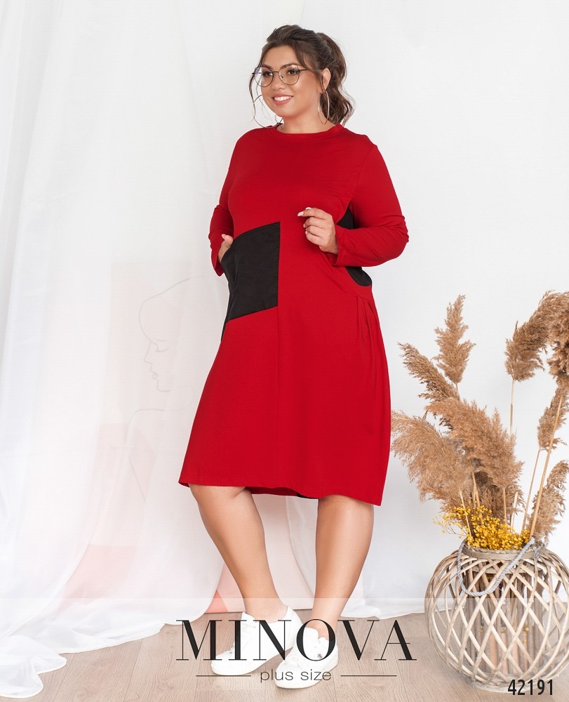 Элегантное платье батал без застёжек, справа - аппликации из другой ткани, выполняющие роль кармана. Рукава без манжет, вырез горловины полукруглый. Справа на боку ткань присобрана.