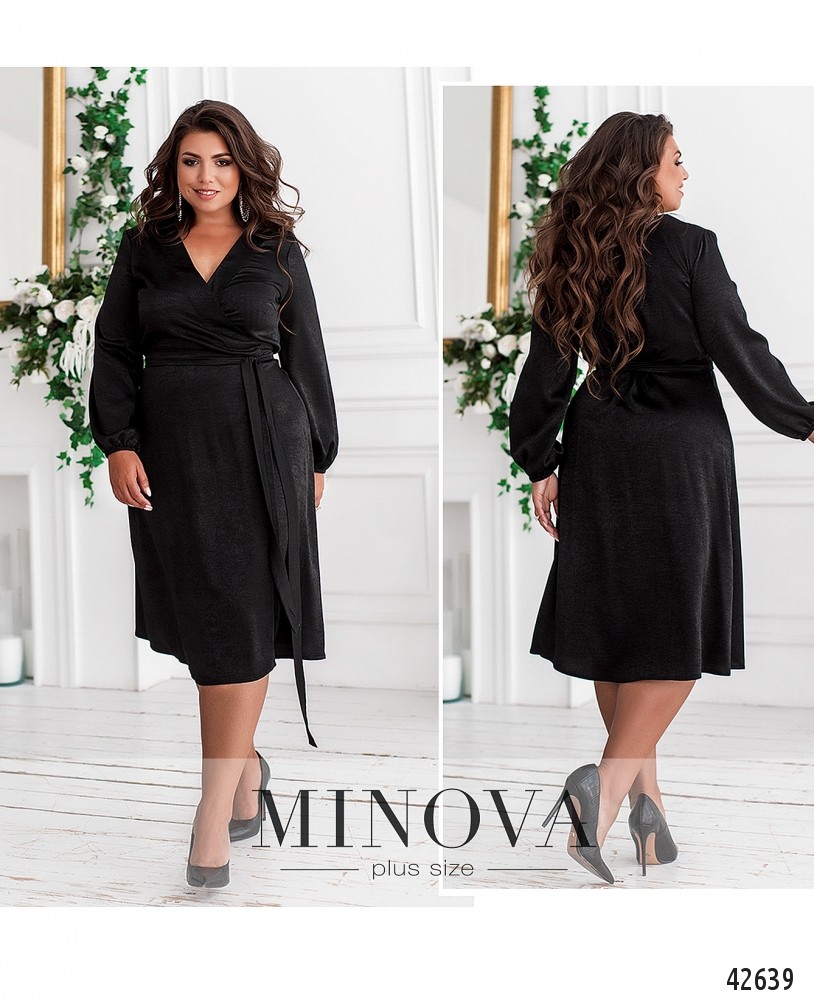 Элегантное платье большого размера на запАх, лента продевается в отверстие на талии и обёртывается вокруг пояса. Карманов нет. В рукава на запястьях вшиты резинки. На груди вытачки.