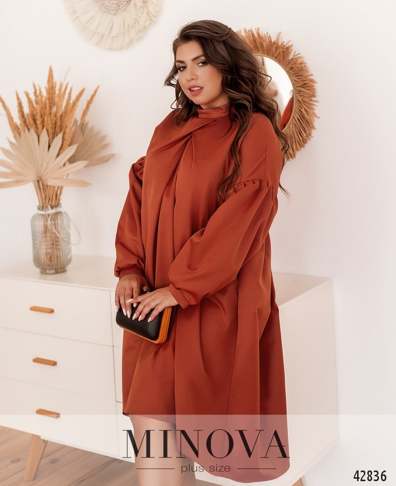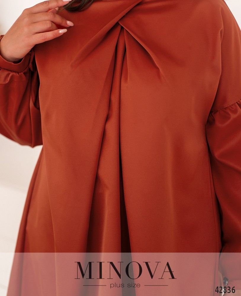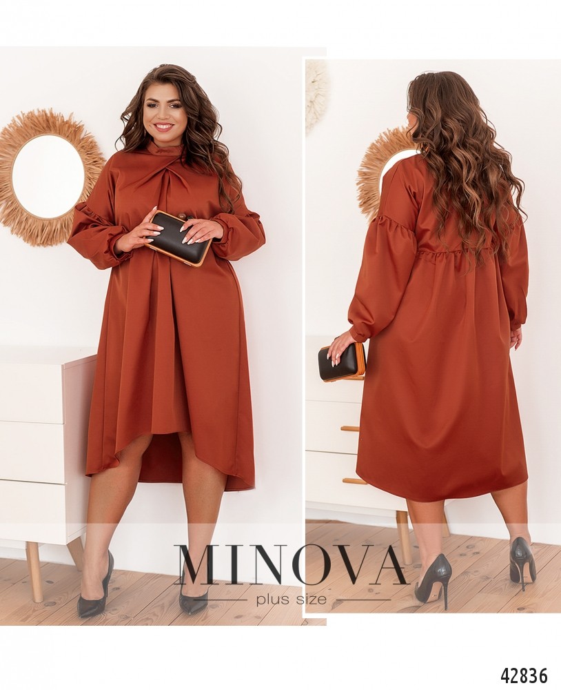 Оригинальное платье батал с присобранной под воротником-стоечкой тканью, расходящейся от груди. Рукава-буф, с небольшими манжетами, на манжетах по одной пуговице. Карманов нет. Ткань подола на спинке подшита к верху и расклешена. Подол асимметричный, по спинке длиннее. Украшение входит в комплект.