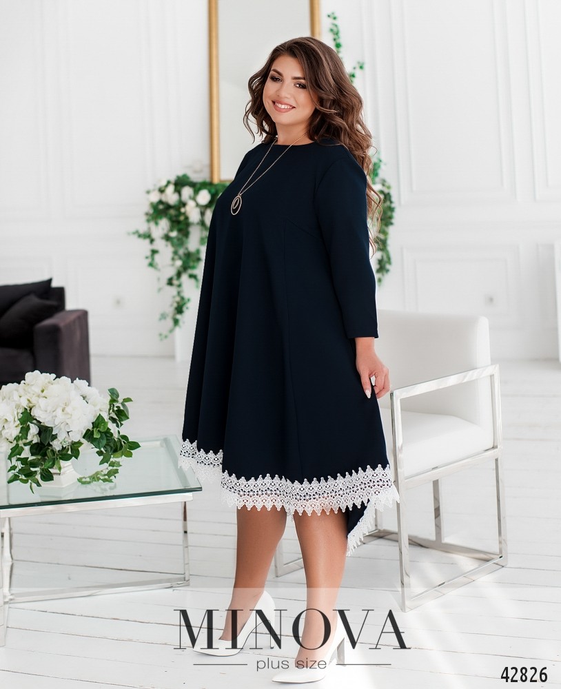 Романтичное платье плюс сайз, украшенное кружевом по подолу. На груди - вытачки, вырез горловины спереди полукруглый, по спинке - фигурный, с бантом и присобранной и расклешённой тканью. Рукава без манжет. Застёжек нет. По бокам - врезные карманы.