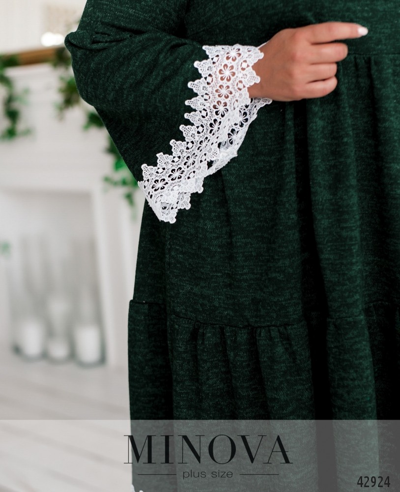 Женственное платье А-силуэта, украшенное кружевом на рукавах и подоле. Подол с двумя рядами оборок. Рукава-фонарики, расклешены от локтя. На груди вытачки, вырез горловины "лодочка". Застёжек и карманов нет.