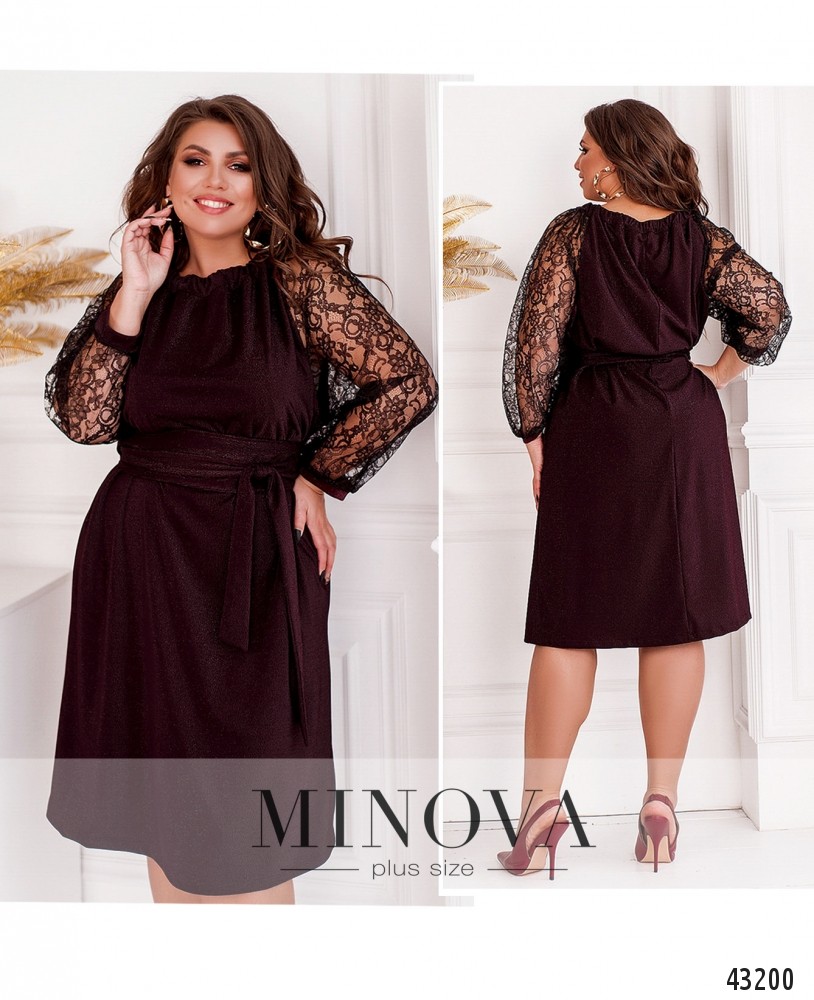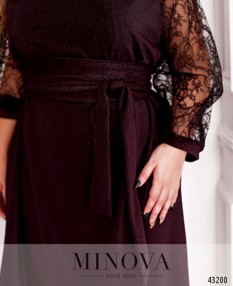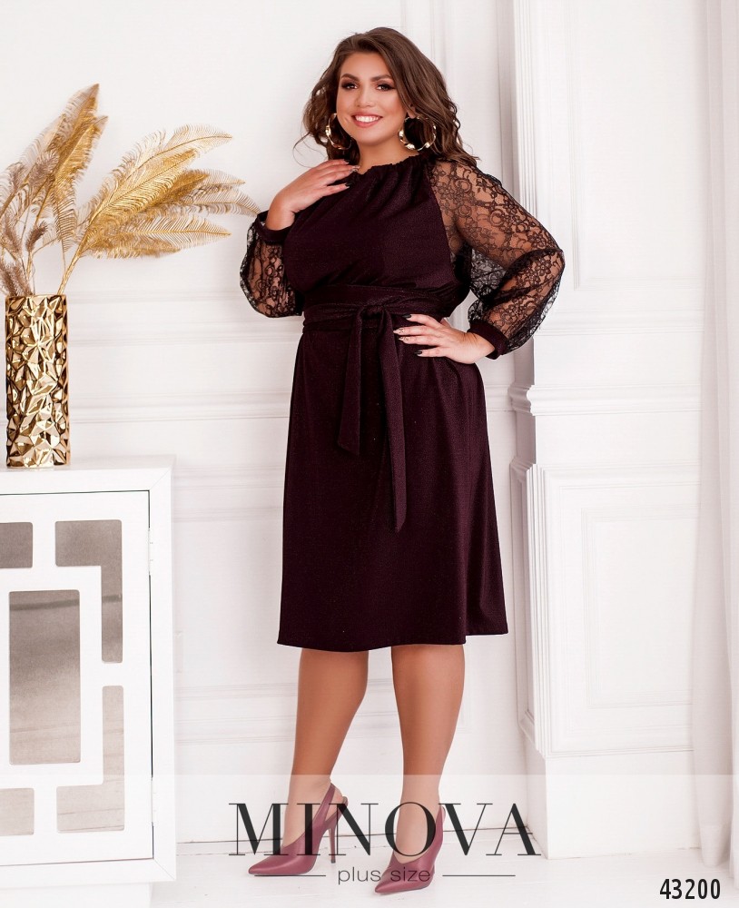 Элегантное платье батал с поясом, в верхнюю часть вшита плотная резинка. Рукава из ажурного гипюра с плотными манжетами без пуговиц. Застёжек и карманов нет.
