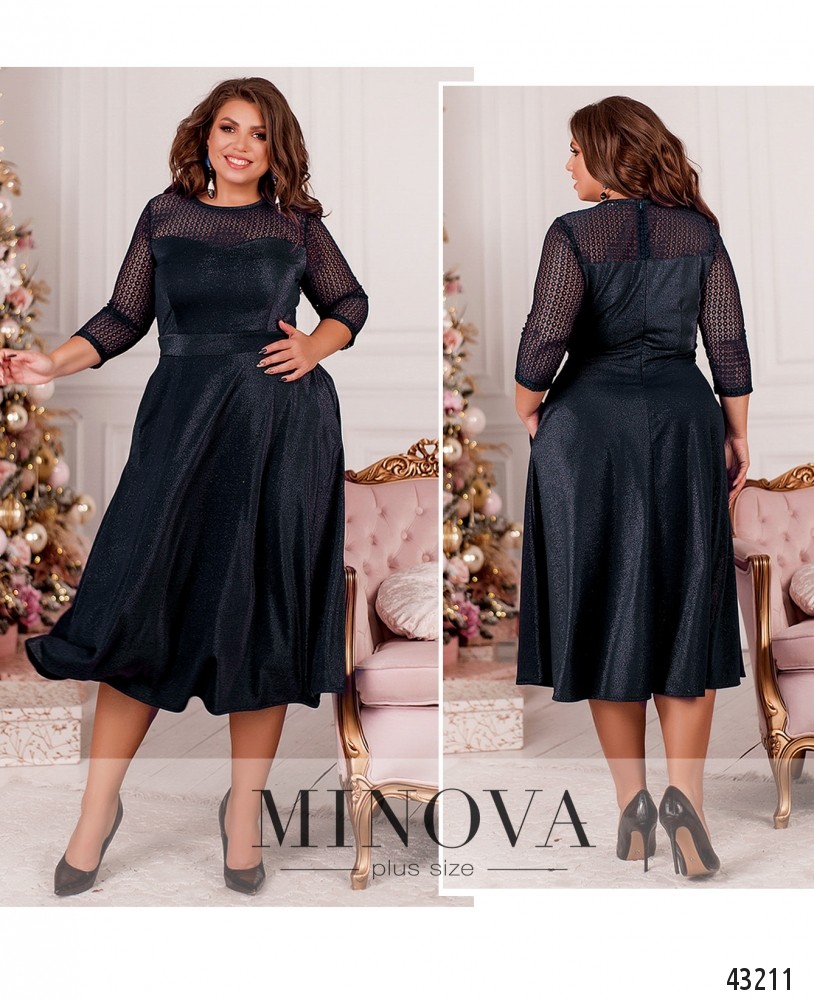 Элегантное платье батал с кружевным верхом и рукавами, рукава без манжет. Вырез плотной ткани в форме фигурного каре, вырез кружевной части - полукруглый. Подол подшит к лифу и отделён полосой "пояска". Ткань с люрексом, застёжка - молния, вшитая по спинке, по бокам - врезные карманы. На груди продольные вытачки.