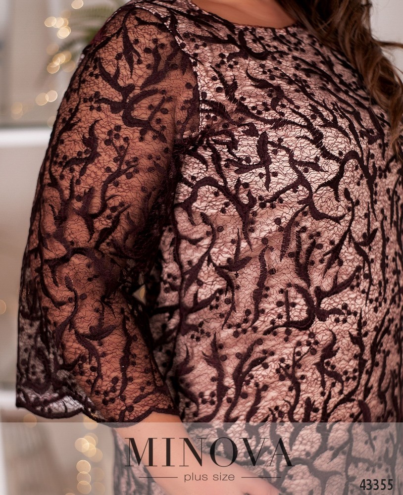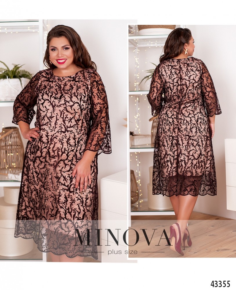 Элегантное вечернее платье батал с мягким нижним слоем и полупрозрачным верхним, украшенным вышивкой. Рукава без подкладки и манжет, край фигурный. Застёжек и карманов нет, вырез горловины полукруглый.