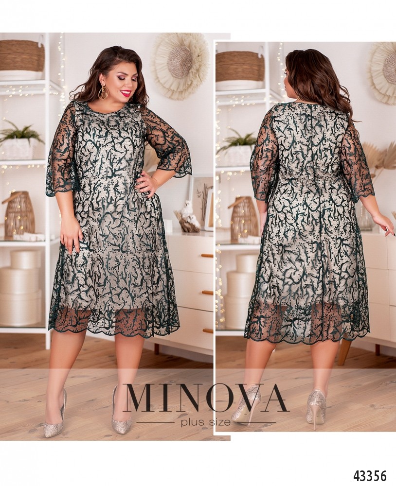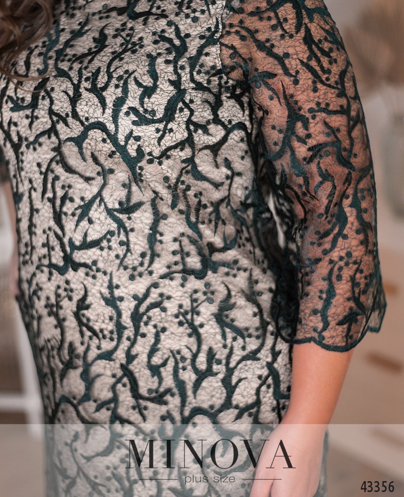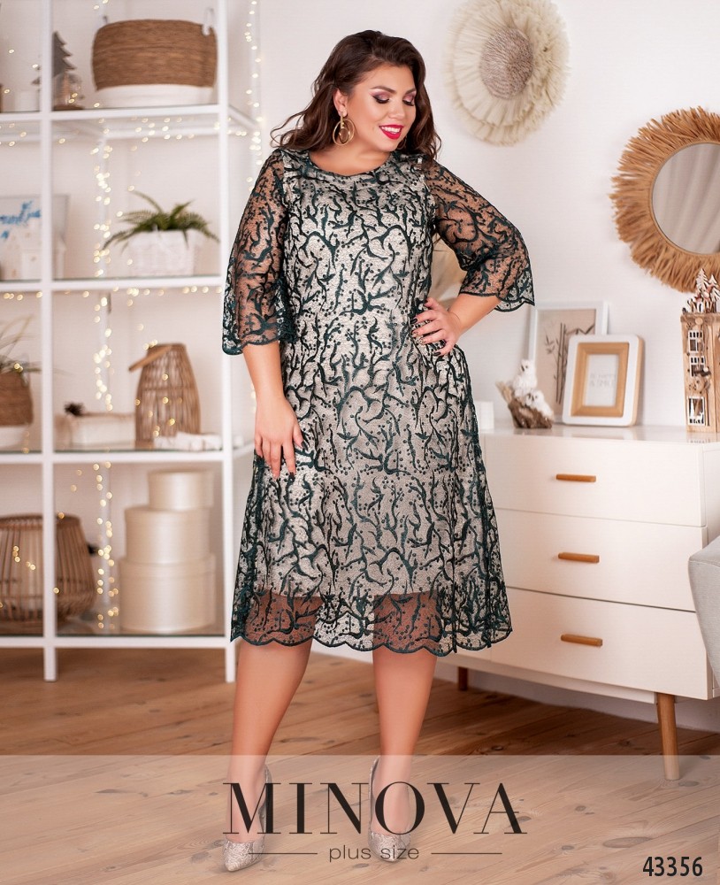 Элегантное вечернее платье батал с мягким нижним слоем и полупрозрачным верхним, украшенным вышивкой. Рукава без подкладки и манжет, край фигурный. Застёжек и карманов нет, вырез горловины полукруглый.