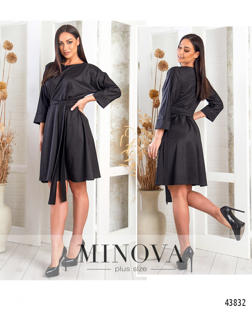 Элегантное платье плюс сайз без застёжек и карманов, подол подшит к лифу и расклешён, в комплекте пояс. Рукава с мягкими манжетами. На спинке продольные вытачки, вырез горловины "лодочка". Пояс/аксессуар входит в комплект.