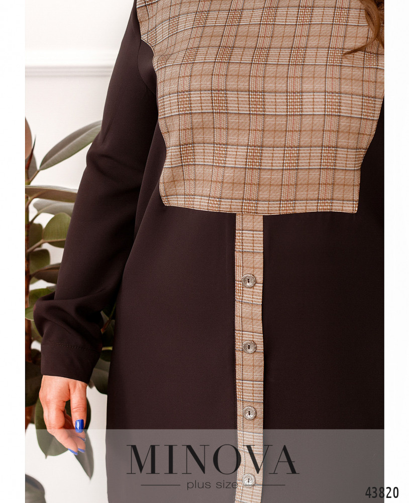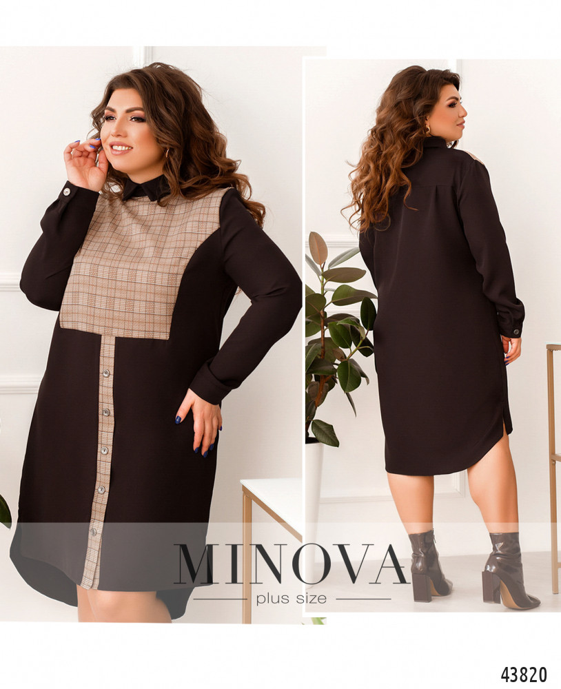 Привлекательное платье большого размера с однотонной спинкой и яркими вставками на лифе и подоле. Подол с декоративными пуговицами по центру на контрастной планке, сзади шлица. Карманов нет. Воротничок отложной, застёжка - пуговка сзади под шеей. На рукавах небольшие манжеты с одной пуговкой. По спинке кокетка с небольшими оборками.