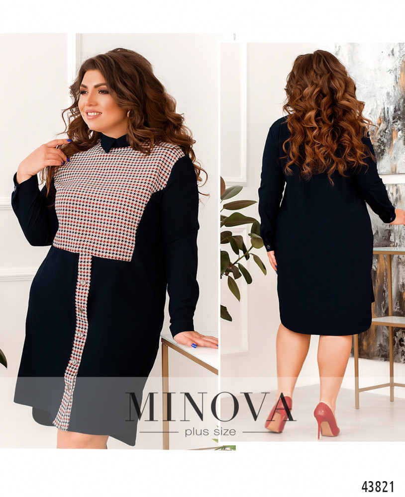 Привлекательное платье большого размера с однотонной спинкой и яркими вставками на лифе и подоле. Подол с декоративными пуговицами по центру на контрастной планке, сзади шлица. Карманов нет. Воротничок отложной, застёжка - пуговка сзади под шеей. На рукавах небольшие манжеты с одной пуговкой. По спинке кокетка с небольшими оборками.