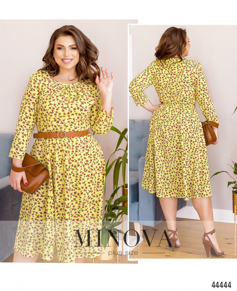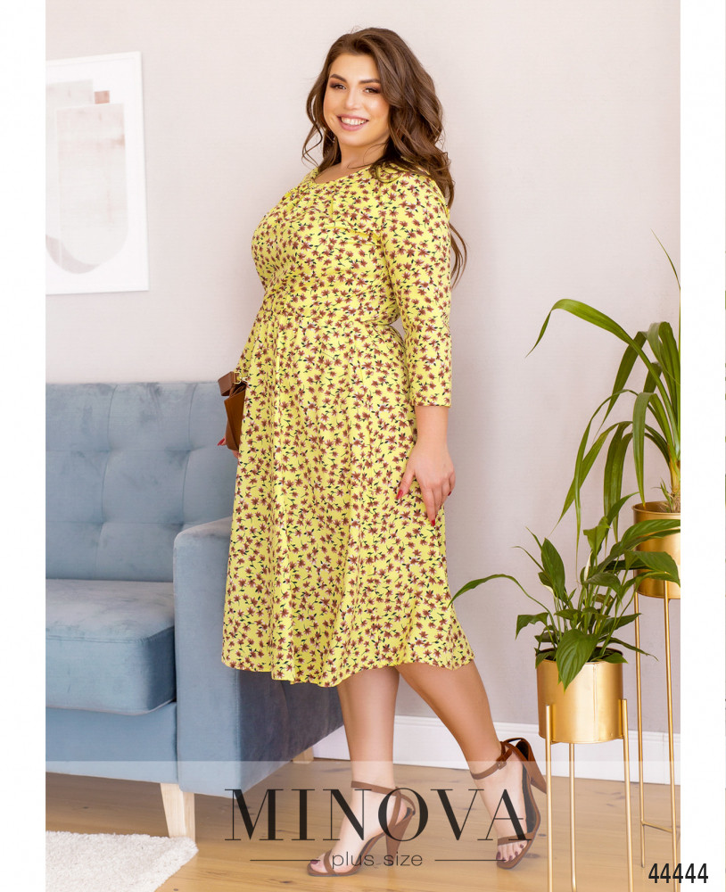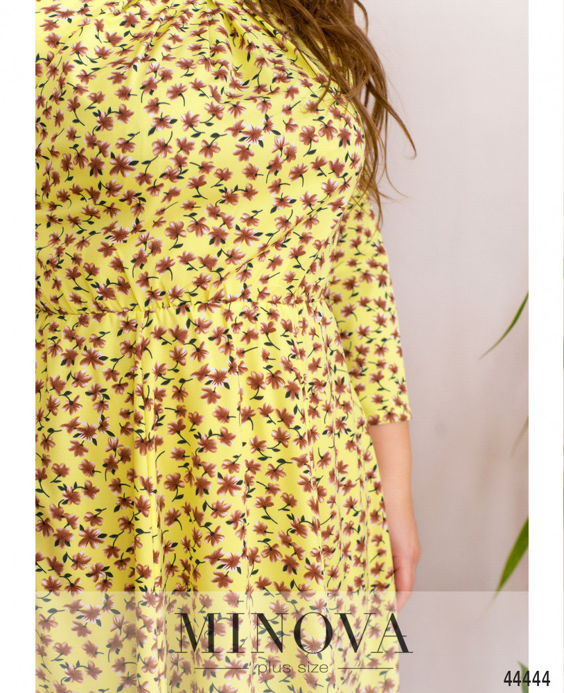 Яркое и женственное платье батал с принтом, вырез горловины полукруглый, от него расходятся плиссированные вытачки на грудь. В пояс вшита резинка. Рукава без манжет. Застёжек и карманов нет.
