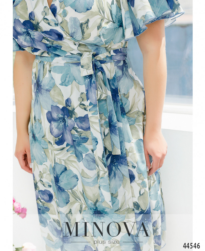 Элегантное и романтичное платье на запАх с ровной линией подола. Рукава - расклешённые "крылышки". Застёжек и карманов нет, запахивается с помощью лент, которые продеваются в отверстие на талии.