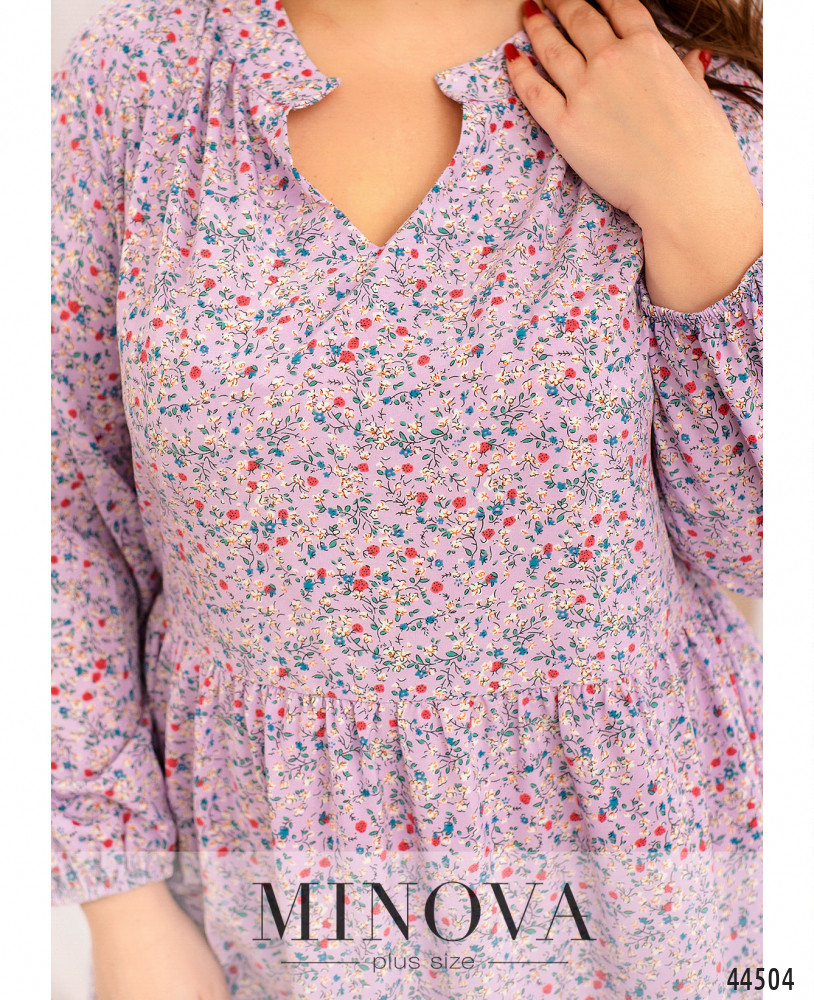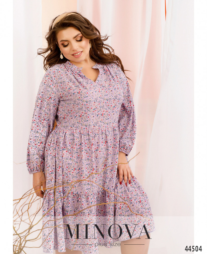 Стильное лёгкое платье плюс сайз без карманов и застёжек, воротник - небольшая "стоечка", под ним неглубокий вырез. В рукава на запястьях вшиты резинки. Платье без подкладки. Подол с несколькими рядами оборок.