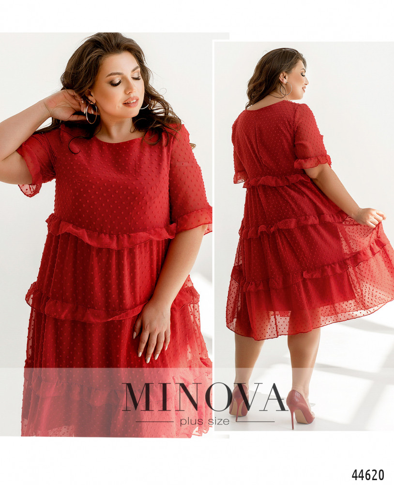 Нежное платье батал А-силуэта, без застёжек и карманов. Нижний слой мягкий, верхний - полупрозрачный, с несколькими рядами оборок. Рукава без подкладки, с оборками на месте манжет. Вырез горловины полукруглый.
