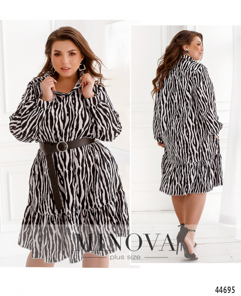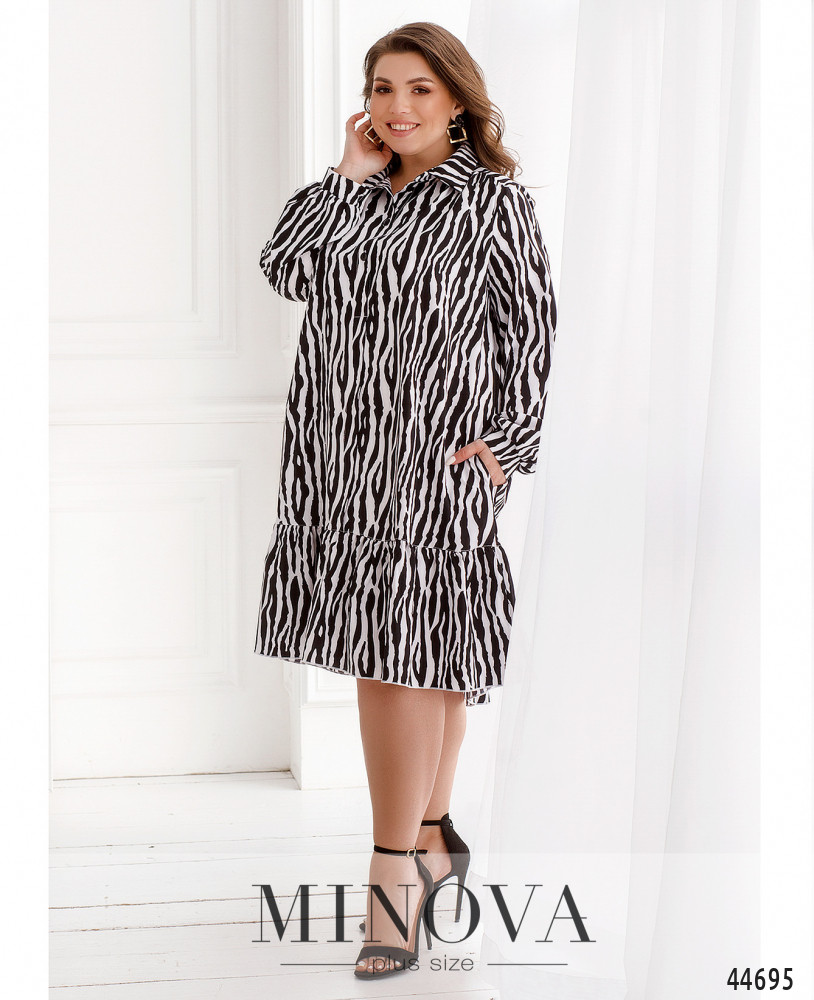 Стильное платье плюс сайз, воротничок отложной, пуговицы на планке от воротничка до середины груди. Рукава с манжетами, на манжетах по одной пуговке. По бокам - карманы в шве. Подол украшен оборками.