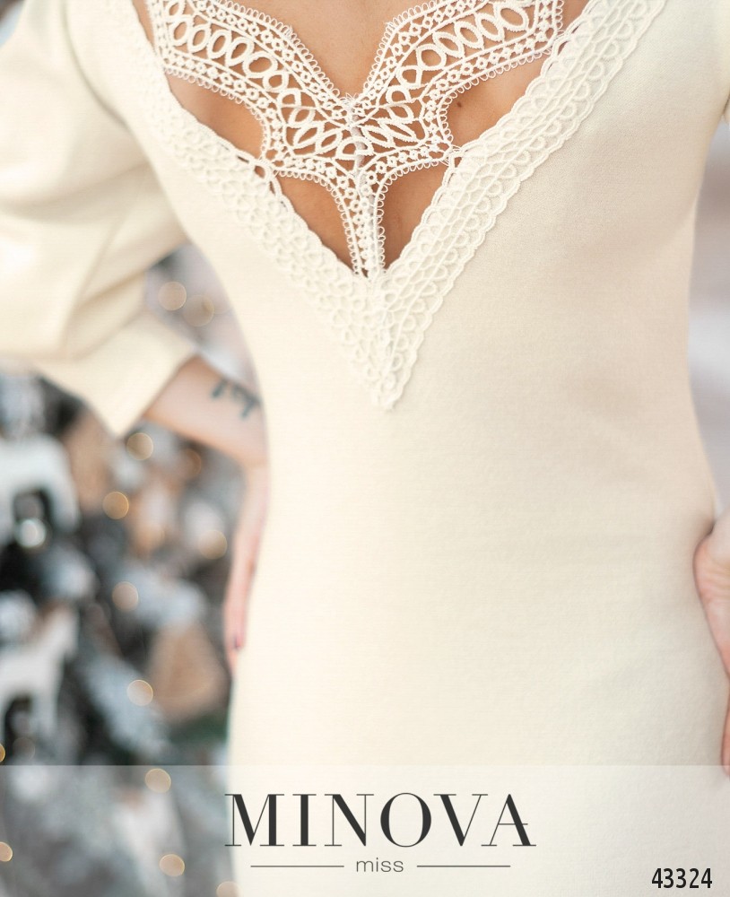 Романтичное платье с оригинальным "епископским" рукавом, с удлинёнными манжетами без пуговиц. Декольте V-образное, украшено кружевом. Застёжек и карманов нет.