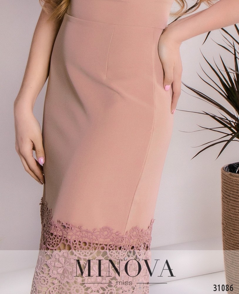 Романтичное платье по фигуре с кружевом «кроше» на рукавах и подоле. Отрезной лиф на запАх скроен с вытачками. Рукава выполнены из кружева. Талия с поясом-вставкой. Подол украшен широкой отрезной кружевной лентой. На спине платье застегивается на скрытую молнию и дополнено разрезом по линии шага.
