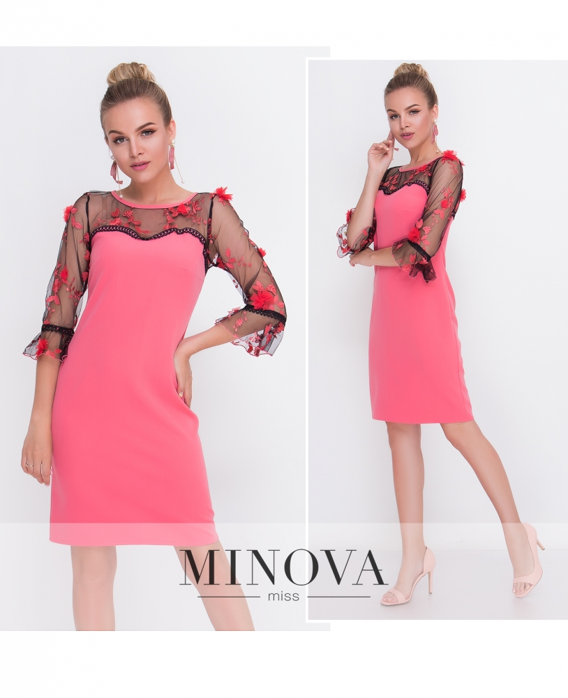 Элегантное платье по фигуре с сетчатыми рукавами ¾ с воланами и вышивкой. На спинке платье застегивается на пуговицу и скрытую молнию.