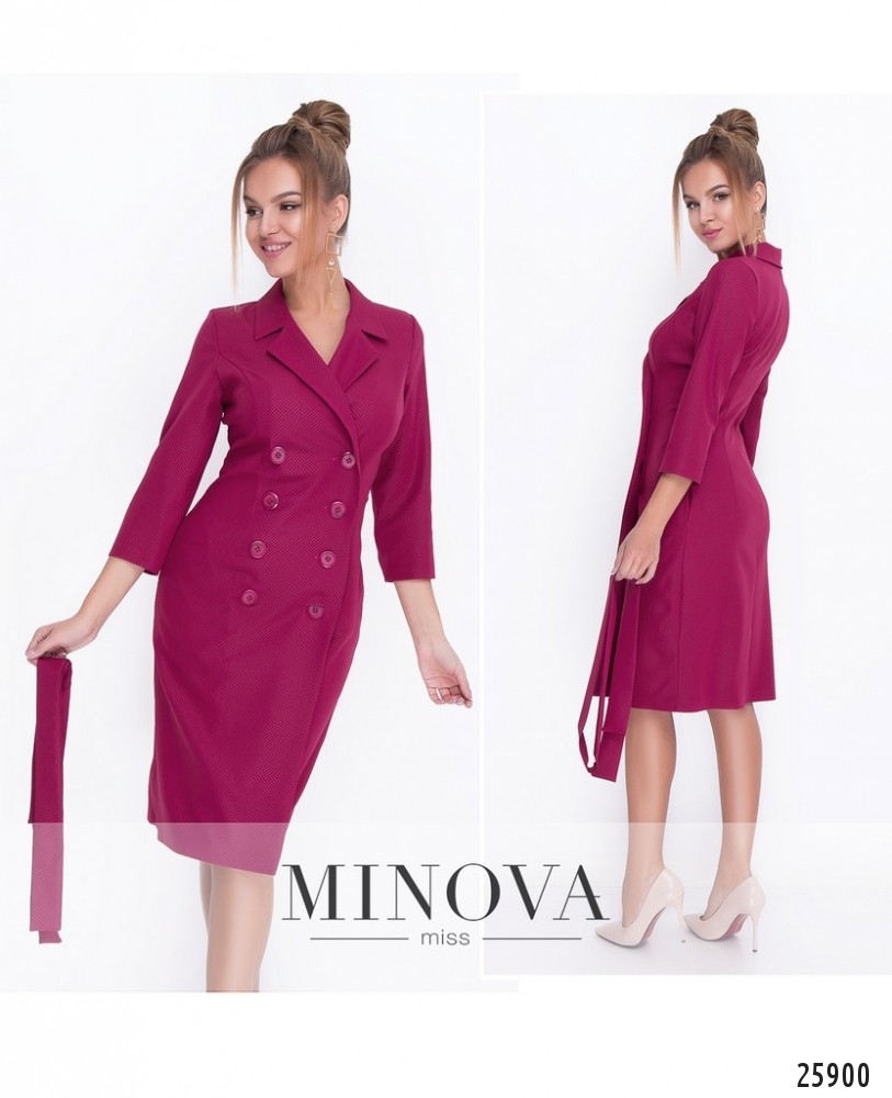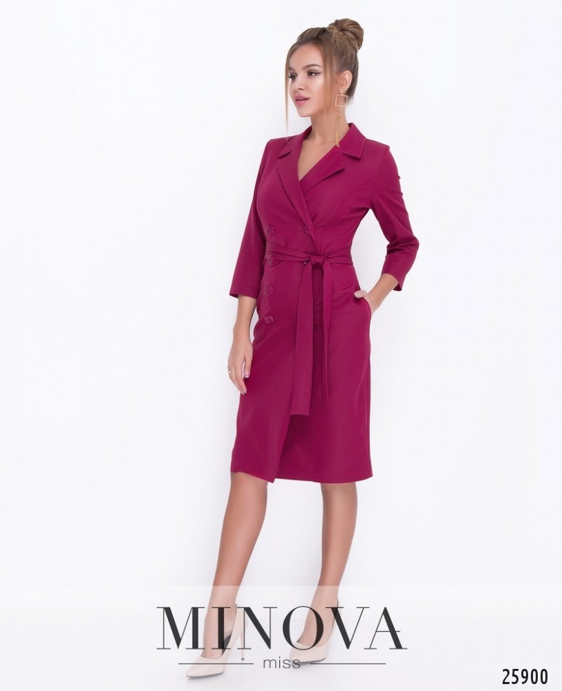 Элегантное двубортное платье-пиджак с поясом. Платье с отложным воротником застегивается на внутреннюю пуговицу и на внешнюю на запах. Платье подчеркивает силуэт. Дополнительно можно выделить талию с помощью пояса в тон. Длина рукава ¾. Платье дополнено карманами.