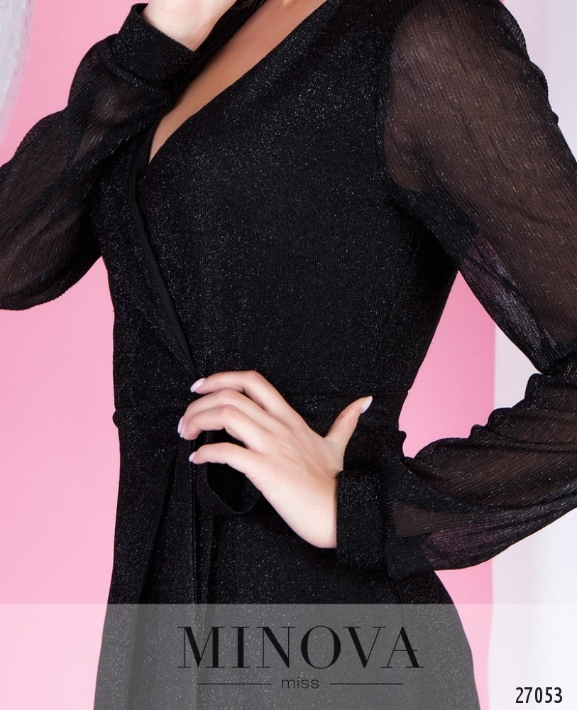 Сногсшибательное платье-миди на запАх из люрекса. Платье повторяет контуры тела, благодаря внутренней петельке и длинному двойному поясу. Пояс завязывается в бант на лицевой стороне. Рукава из полупрозрачной сетки-гофрэ собраны в манжеты. Платье идеально подходит для вечеринок и выходов в свет.