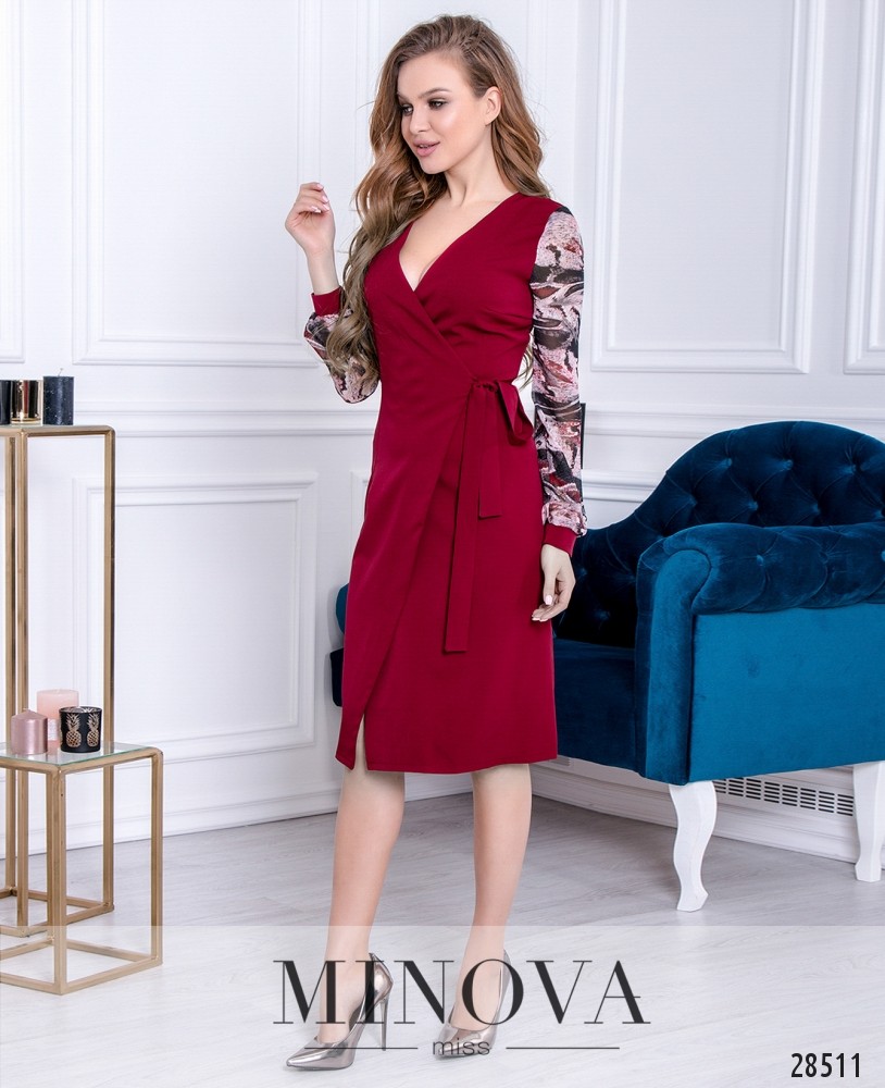 Интригующее платье на запАх с контрастными рукавами. Цветные рукава изготовлены из шифона и оформлены однотонными манжетами в тон основного материала. Платье на запАх фиксируется с помощью внутренней петли и длинного пояса.