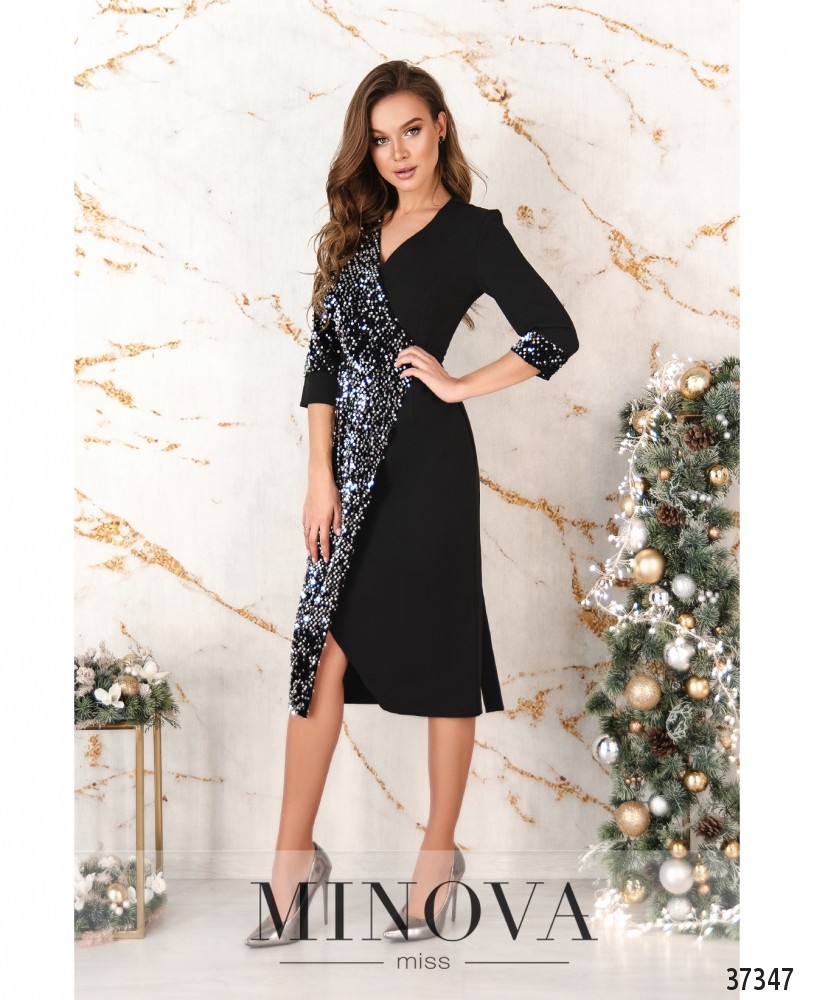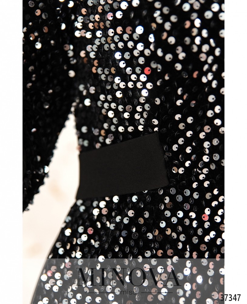 Приталенное нарядное платье. Правая сторона украшена пайетками, рукав декорирован с двух сторон. Левая сторона однотонная. На правом рукаве манжет однотонный, на левом – с пайетками. На талии вшит пояс, который завязывается сзади. Верх и подол подшиты на запАх. Карманов нет. Спинка без декора, с продольными вытачками и вшитой молнией.