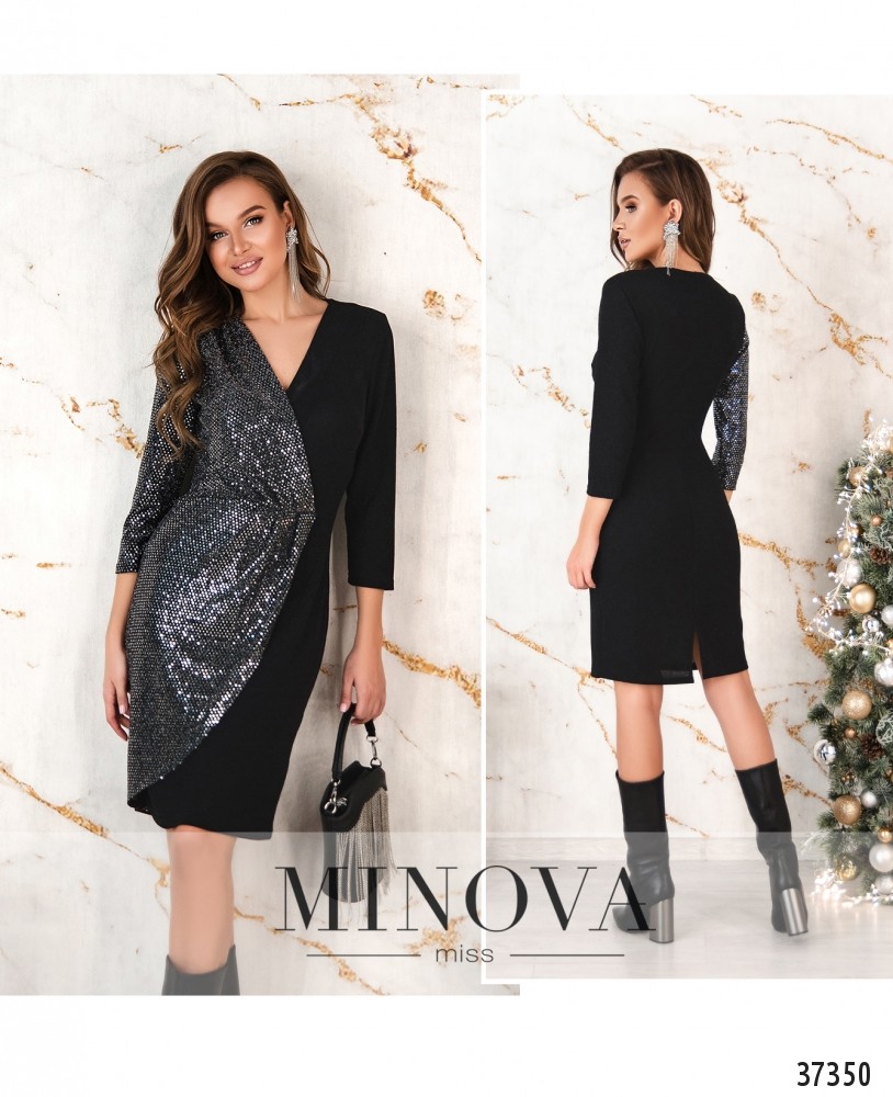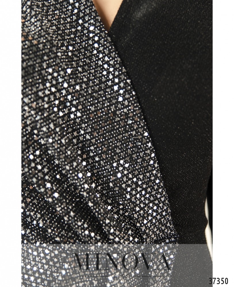 Стильное приталенное платье для вечеринок. Верх и подол подшиты на запАх. Правая сторона, включая рукав с двух сторон, украшена пайетками, левая сторона т спинка из ткани с люрексом. На груди диагональные вытачки, на спине - продольные. Рукава без манжет. В пояс вшита резинка. Карманов и застёжек нет. Сзади на подоле небольшая шлица.